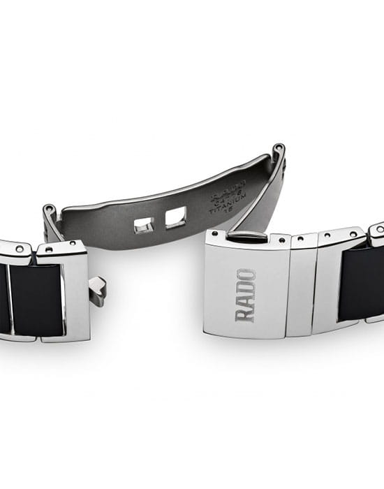 Браслет из высокотехнологичной керамикиВысокотехнологичная керамикаИнновационный запатентованный Rado материал с гладкой или матовой поверхностью. Керамика за счёт кристаллической структуры обладает повышенной устойчивостью от возникновения царапин. Материал способен принимать температуру тела человека, обеспечивая невероятный комфорт при ношении. и нержавеющей стали на застёжке-бабочке с кнопкамиЗастёжка "бабочка"Такой вид застёжки дополняется предохранителями, помогающими избежать случайного раскрытия браслета. Обладают изящным исполнением. обеспечивает комфортное и надёжное ношение.