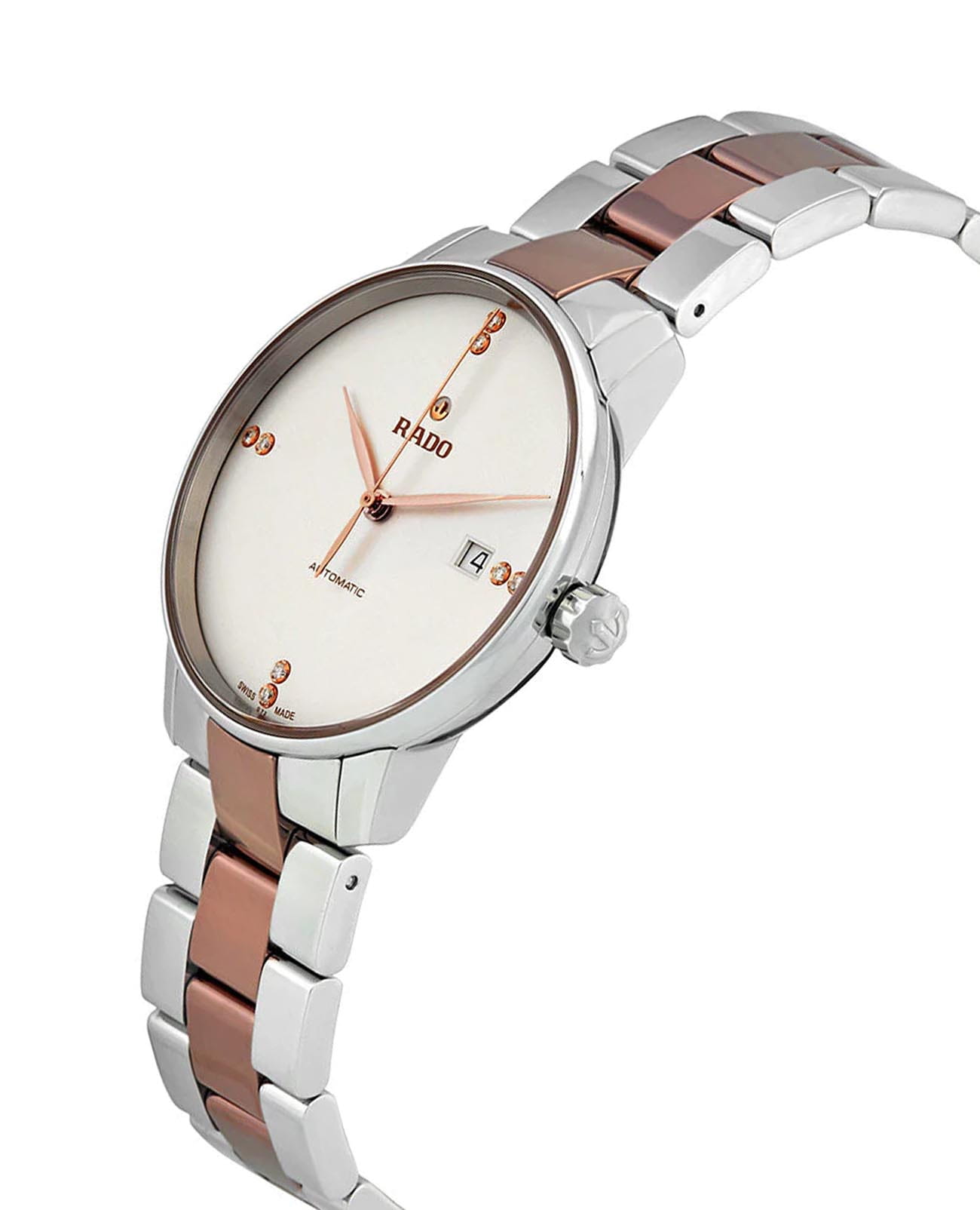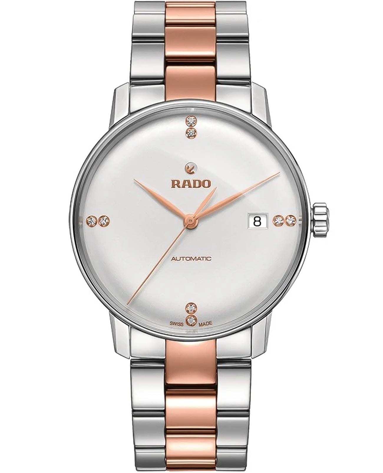 Мужские швейцарские механические часы с автоподзаводом Rado Coupole R22860722. Корпус часов изготовлен из нержавеющей стали. Сапфировое стеклоСапфировое стеклоПрочный и надёжный материал из кристалла сапфира синтетического происхождения, характеризующийся особой твёрдостью и устойчивостью к царапинам и повреждениям. устойчивое к мелким механическим повреждениям. Стальной браслет с частичным PVD-покрытиемPVDУльтратонкое покрытие наносится в технике вакуумного напыления, сочетает в себе нитрид титана особой прочности со слоем золота или оксида хрома. Несёт в себе декоративную или защитную функцию. на раскладной застёжкеРаскладная застёжкаТакой тип застёжки используется только на браслетах из металла. Она никогда не раскрывается полностью, происходит разделение на 2 и более частей. Раскладывающая застёжка снизит вероятность потери часов к минимуму.. Класс водозащиты: 50 метров, позволит защитить корпус от случайных брызг или капель дождя. Окошко даты находится в положении 3 часа. Циферблат инкрустирован бриллиантами.