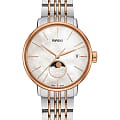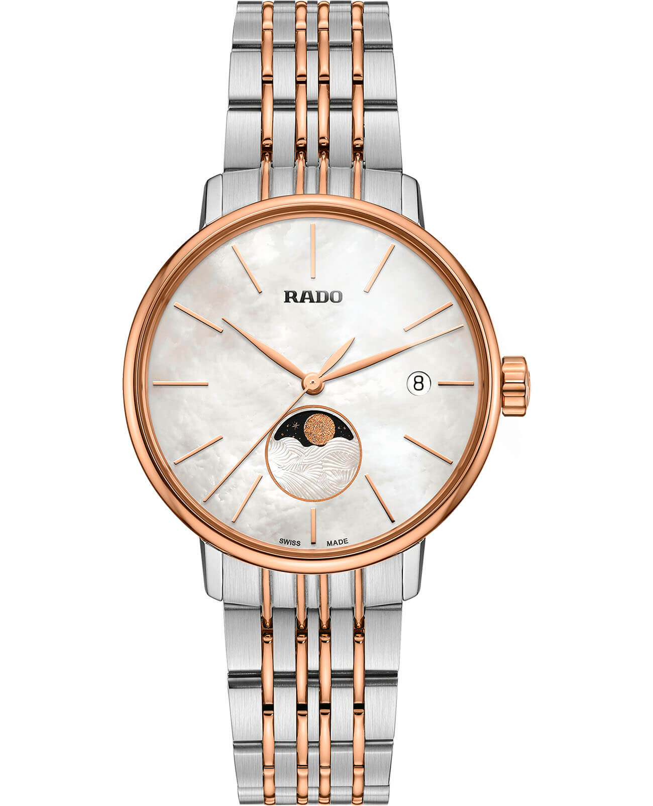 Роскошный перламутровый циферблат завораживает переливающимися оттенками, такое исполнение являет собой настоящую элегантность и особый стиль. Привлекательностью обладает и календарь, отображающий фазы луны. Подобное оформление идеально сочетается с необычным стальным браслетом. Часы работают за счёт высокоточного кварцевого калибра ETA F05.841. Стекло из сапфира имеет антибликовое покрытие. PVD-покрытиеPVDУльтратонкое покрытие наносится в технике вакуумного напыления, сочетает в себе нитрид титана особой прочности со слоем золота или оксида хрома. Несёт в себе декоративную или защитную функцию. корпуса и браслета, оттенок "розовое золото". Апертура даты. Диаметр корпуса: 34 мм.