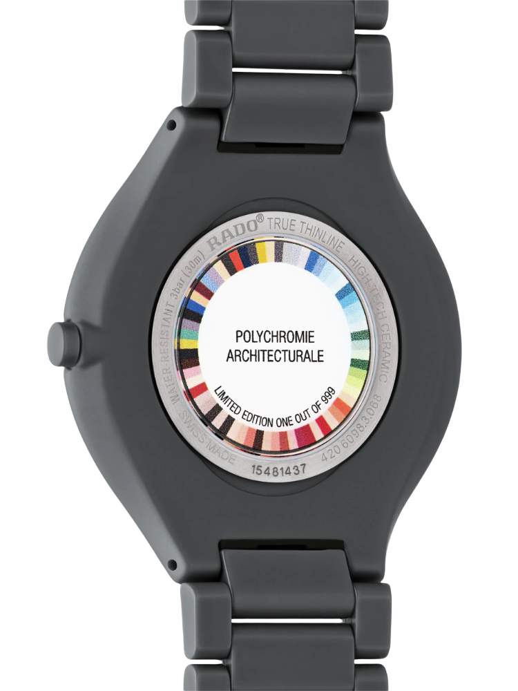 Швейцарские часы из лимитированной серии 999 экземпляров Rado True Thinline Le Corbusier R27091612, кварцевый механизм с высокой точностью. Сапфировое стекло устойчивое к появлению царапин, обладающее высокой прозрачностью. Класс водозащиты: 30 метров, позволит защитить корпус от случайных брызг или капель дождя. Корпус часов изготовлен из керамики, цвета.