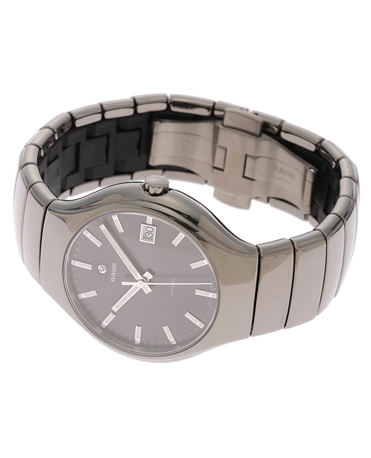 Мужские механические швейцарские часы с автоподзаводом Rado True R27351112. Сапфировое стеклоСапфировое стеклоПрочный и надёжный материал из кристалла сапфира синтетического происхождения, характеризующийся особой твёрдостью и устойчивостью к царапинам и повреждениям. устойчивое к мелким механическим повреждениям. Корпус часов изготовлен из высокотехнологичной керамикиВысокотехнологичная керамикаИнновационный запатентованный Rado материал с гладкой или матовой поверхностью. Керамика за счёт кристаллической структуры обладает повышенной устойчивостью от возникновения царапин. Материал способен принимать температуру тела человека, обеспечивая невероятный комфорт при ношении.. Окошко даты находится в положении 3 часа. Стрелки с люминесцентным покрытиемЛюминесцентное покрытиеПозволяет считывать показания времени в темноте. Производители наносят на стрелки, часовые индексы, безель или поверхность циферблата светонакопительный состав, дающий холодное свечение.. Браслет из высокотехнологичной керамикиВысокотехнологичная керамикаИнновационный запатентованный Rado материал с гладкой или матовой поверхностью. Керамика за счёт кристаллической структуры обладает повышенной устойчивостью от возникновения царапин. Материал способен принимать температуру тела человека, обеспечивая невероятный комфорт при ношении. на застёжке-бабочке с кнопкамиЗастёжка "бабочка"Такой вид застёжки дополняется предохранителями, помогающими избежать случайного раскрытия браслета. Обладают изящным исполнением. .
