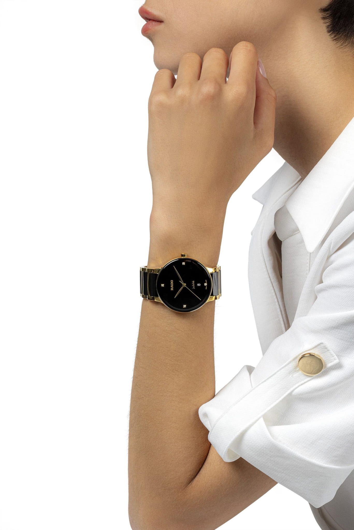 Швейцарские часы с надёжным кварцевым механизмом Rado Centrix Diamonds R30022712. Корпус часов изготовлен из нержавеющей стали с PVD-покрытиемPVDУльтратонкое покрытие наносится в технике вакуумного напыления, сочетает в себе нитрид титана особой прочности со слоем золота или оксида хрома. Несёт в себе декоративную или защитную функцию.. Браслет из стали и высокотехнологичной керамикиВысокотехнологичная керамикаИнновационный запатентованный Rado материал с гладкой или матовой поверхностью. Керамика за счёт кристаллической структуры обладает повышенной устойчивостью от возникновения царапин. Материал способен принимать температуру тела человека, обеспечивая невероятный комфорт при ношении. на раскладной застёжкеРаскладная застёжкаТакой тип застёжки используется только на браслетах из металла. Она никогда не раскрывается полностью, происходит разделение на 2 и более частей. Раскладывающая застёжка снизит вероятность потери часов к минимуму.. Сапфировое стеклоСапфировое стеклоПрочный и надёжный материал из кристалла сапфира синтетического происхождения, характеризующийся особой твёрдостью и устойчивостью к царапинам и повреждениям. устойчивое к мелким механическим повреждениям. Класс водозащиты: 50 метров, позволит защитить корпус от случайных брызг или капель дождя. Окошко даты находится в положении 6 часов. Циферблат инкрустирован бриллиантами.