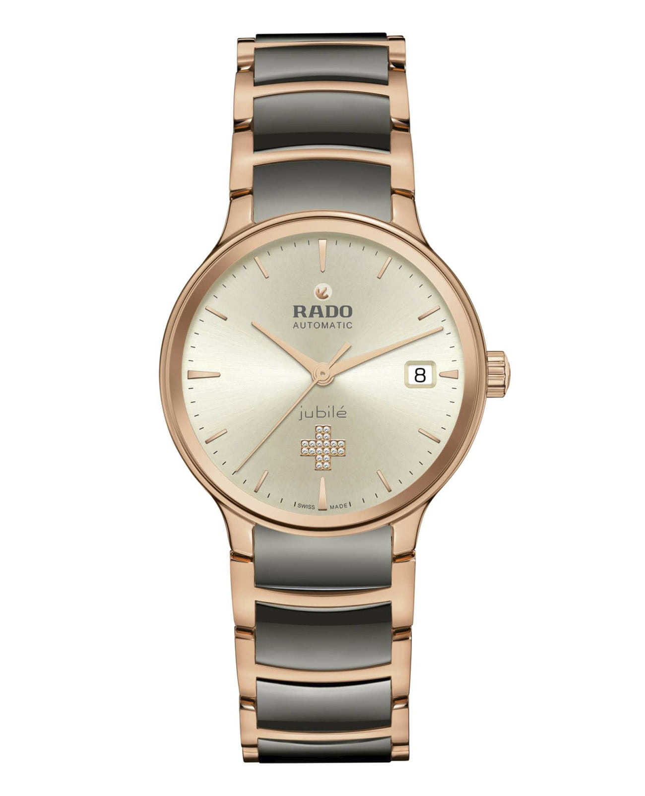 Женские механические часы с автоподзаводом Rado Centrix Swiss Edition — это гармоничное сочетание художественного дизайна и швейцарского мастерства. Корпус диаметром 35 мм и толщиной 11,1 мм выполнен из нержавеющей стали с PVD-покрытиемPVDУльтратонкое покрытие наносится в технике вакуумного напыления, сочетает в себе нитрид титана особой прочности со слоем золота или оксида хрома. Несёт в себе декоративную или защитную функцию. розового золота. Циферблат шампанского цвета с эффектом «солнечные лучи» оформлен розовыми индексами. В положении 6 часов расположено декоративное сварое крест с 20 бриллиантами — символ эксклюзивности швейцарской версии. Окошко даты находится в положении 3 часов. Циферблат защищён выпуклым сапфировым стекломСапфировое стеклоПрочный и надёжный материал из кристалла сапфира синтетического происхождения, характеризующийся особой твёрдостью и устойчивостью к царапинам и повреждениям. с антибликовым покрытиемАнтибликовое покрытиеСлой оксида металла в 0,13-0,3 микрон, благодаря которому стекло часов не бликует и не отражает свет. Антибликовое покрытие уменьшает отражение света в 10 раз, обеспечивая отличную читаемость показателей циферблата. с обеих сторон. Механизм — автоматический калибр R763 с антимагнитной пружиной Nivachron™Nivachron™Специально разработанный инновационный сплав Nivachron™ повышает устойчивость часов к воздействию магнитных полей., отрегулированный в пяти положениях, с запасом хода 80 часов. Прозрачная задняя крышка с сапфировым стеклом позволяет наблюдать за работой механизма. Часы оснащены браслетом из полированной нержавеющей стали с PVD-покрытиемPVDУльтратонкое покрытие наносится в технике вакуумного напыления, сочетает в себе нитрид титана особой прочности со слоем золота или оксида хрома. Несёт в себе декоративную или защитную функцию. розового золота и вставками из высокотехнологичной плазменной керамикиВысокотехнологичная плазменная керамикаИнновационный материал, технология запатентована. Выплавление керамики осуществляется в печи при 20 000 °C, белоснежный материал под воздействием ультравысокой температуры приобретает уникальный блеск, присущий металлам., а также трёхсекционной застёжкой из матовой стали. Идеальный выбор для тех, кто ценит элегантность, точность и эксклюзивность.
