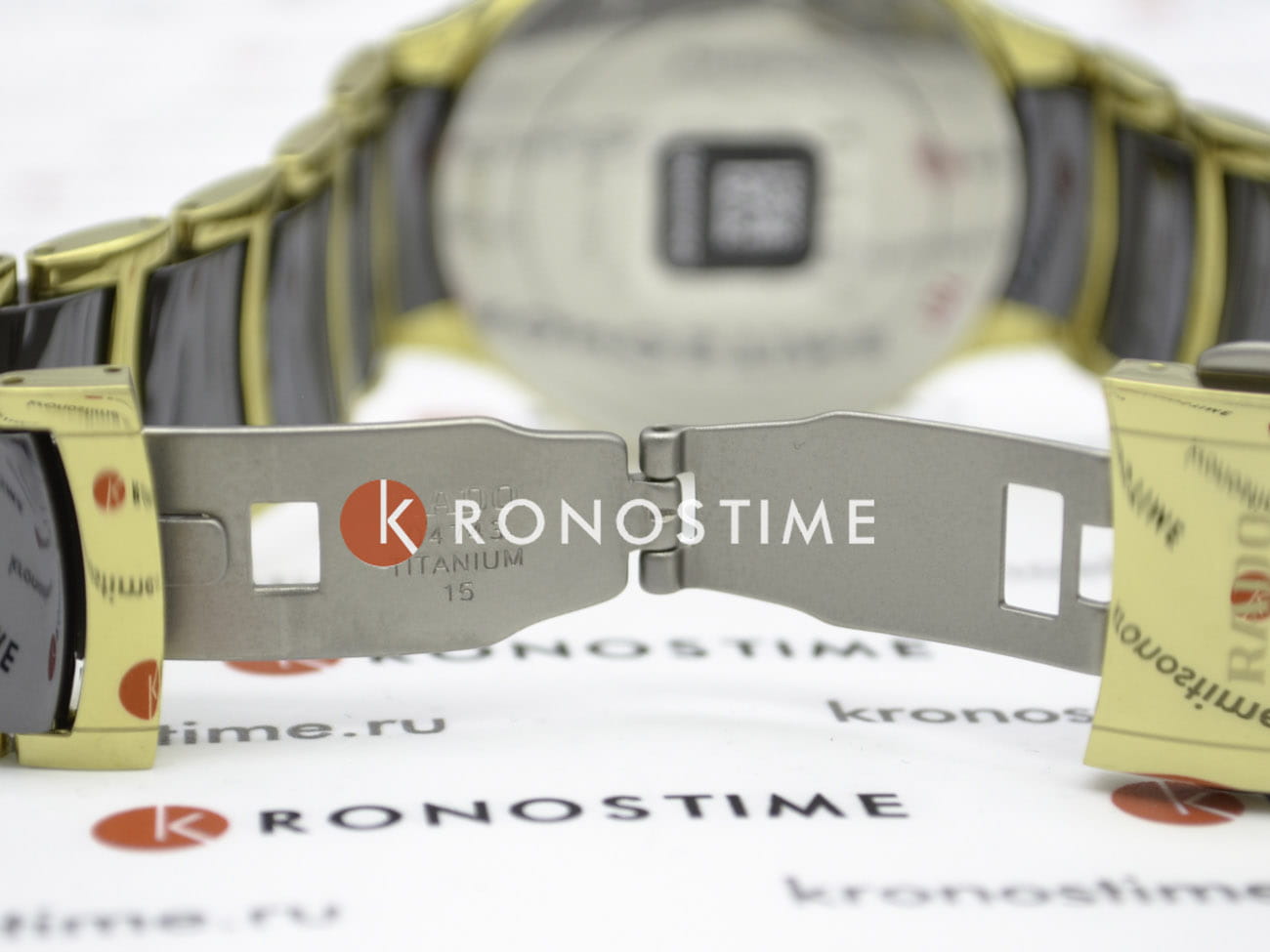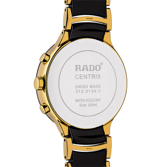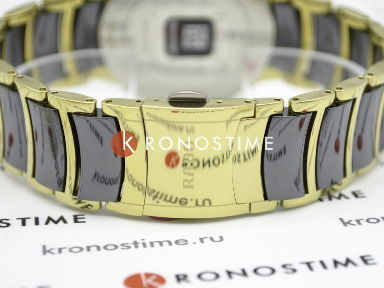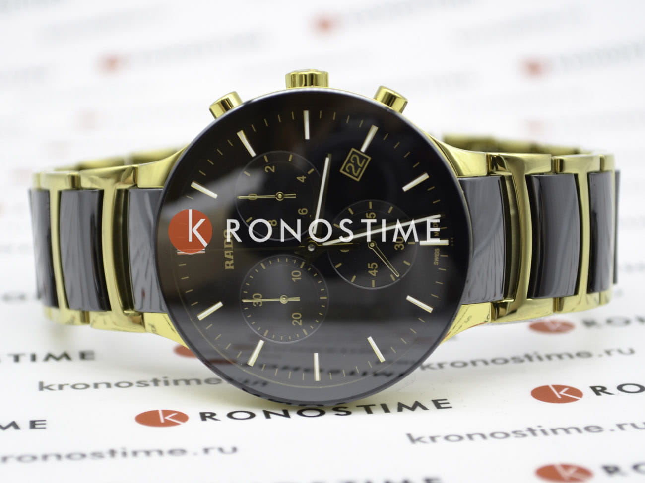 Премиальный хронографХронографФункция позволяет измерять отрезки времени с особой точностью: часы, минуты, секунды. Верным признаком хронографа является наличие на циферблате 3 дополнительных окошек-счётчиков. отличается лаконичным оформлением и использованием сдержанных оттенков. Такое исполнение позволяет носить часы с деловым, повседневным образом, костюмом на торжественный случай. Внутри надёжного корпуса из высокотехнологичной керамикиВысокотехнологичная керамикаИнновационный запатентованный Rado материал с гладкой или матовой поверхностью. Керамика за счёт кристаллической структуры обладает повышенной устойчивостью от возникновения царапин. Материал способен принимать температуру тела человека, обеспечивая невероятный комфорт при ношении. находится кварцевый механизм ETA 251.274 с 22 камнями. Браслет из нержавеющей стали 316L с керамическими вставками и золотистым PVD-покрытиемPVDУльтратонкое покрытие наносится в технике вакуумного напыления, сочетает в себе нитрид титана особой прочности со слоем золота или оксида хрома. Несёт в себе декоративную или защитную функцию.. Сапфировое стекло. Люминесцентная подсветкаЛюминесцентное покрытиеПозволяет считывать показания времени в темноте. Производители наносят на стрелки, часовые индексы, безель или поверхность циферблата светонакопительный состав, дающий холодное свечение.. Апертура даты. Диаметр корпуса: 40 мм.