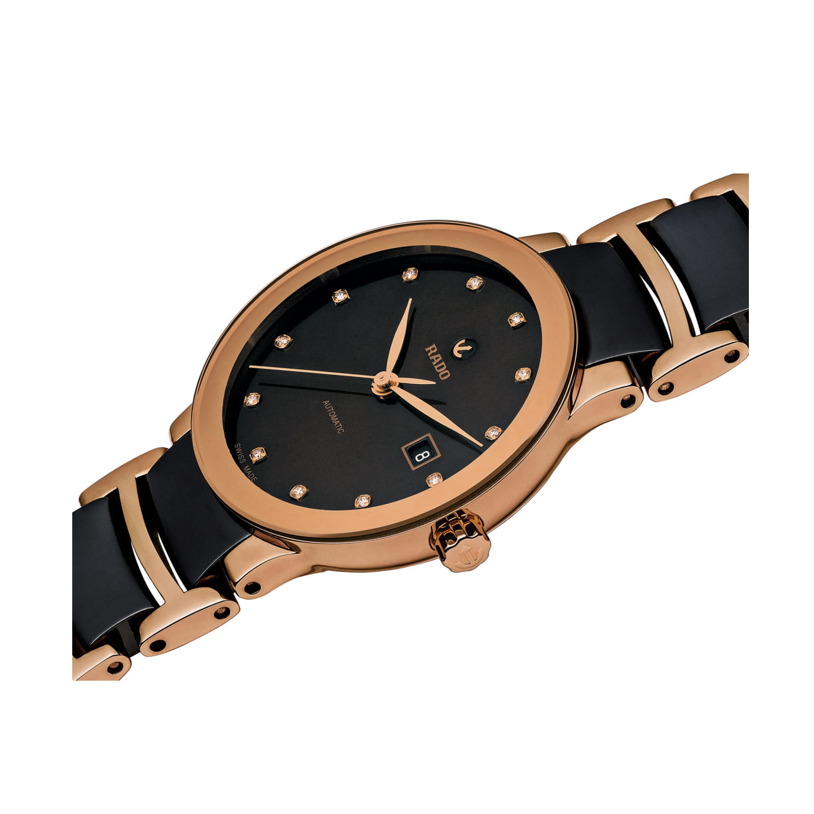 Изысканная модель в минималистичном исполнении грамотно завершит образ. Благодаря роскошному циферблату премиальный аксессуар сразу притягивает внимание, перед блеском 12 бриллиантов. Автоподзавод. Швейцарский калибр ETA 2671 имеет запас хода до 38 часов. Скелетонизированная задняя крышка стального корпуса. Сапфировое стекло. Браслет из нержавеющей стали с PVD-покрытиемPVDУльтратонкое покрытие наносится в технике вакуумного напыления, сочетает в себе нитрид титана особой прочности со слоем золота или оксида хрома. Несёт в себе декоративную или защитную функцию. и вставок из высокотехнологичной керамикиВысокотехнологичная керамикаИнновационный запатентованный Rado материал с гладкой или матовой поверхностью. Керамика за счёт кристаллической структуры обладает повышенной устойчивостью от возникновения царапин. Материал способен принимать температуру тела человека, обеспечивая невероятный комфорт при ношении.. Водонепроницаемость 30 метров. Надёжная . Отображение числа. Диаметр корпуса: 28 мм.