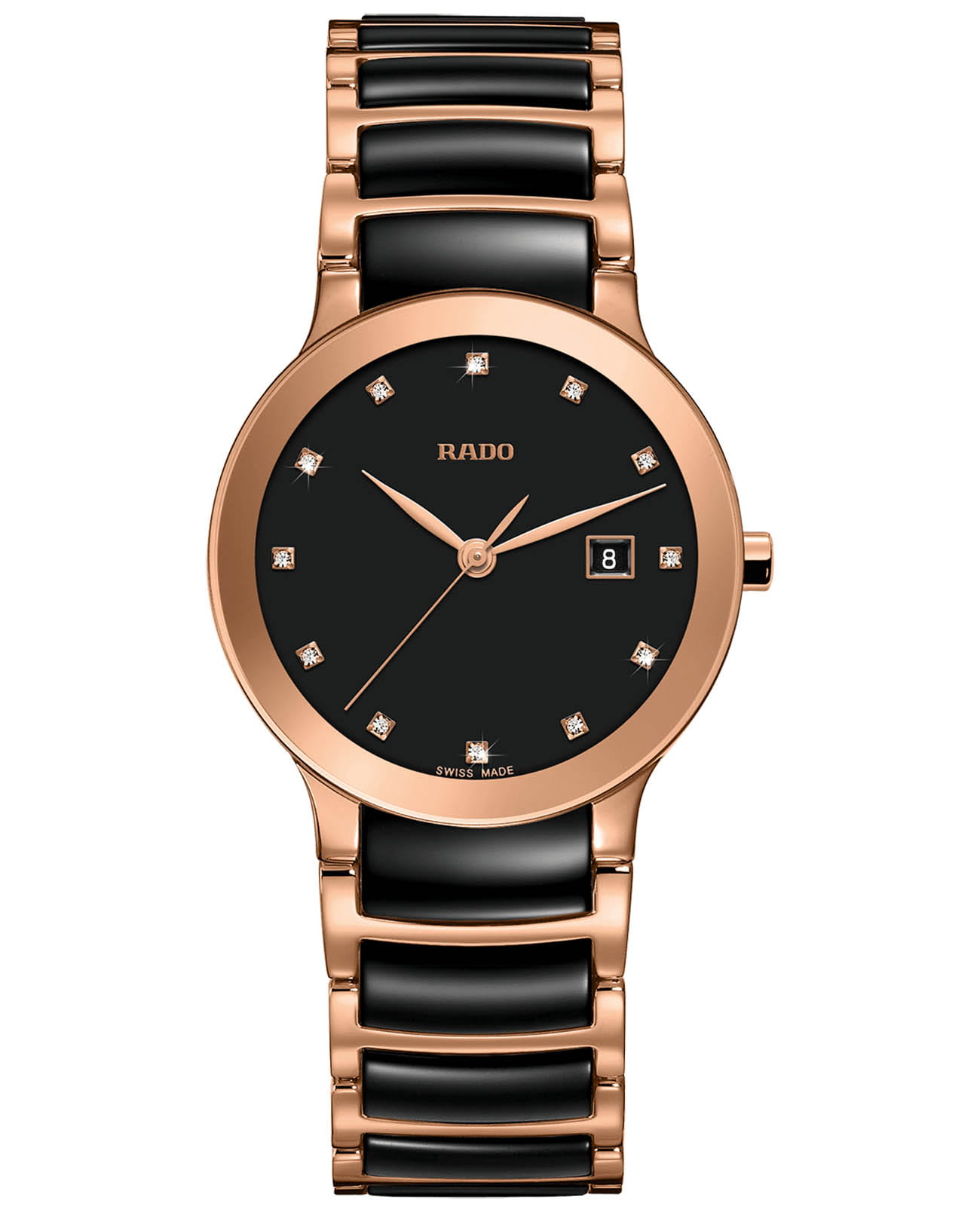 Аксессуар в золотом цвете станет достойным дополнением к образу солидной и деловой женщины. Это стильная деталь современного имиджа, особый шик ей придают 12 бриллиантов. Понаблюдать за движением частиц механизма можно через прозрачную заднюю крышку. Надёжный корпус из хирургической стали 316L. Браслет имеет вставки из высокотехнологичной керамикиВысокотехнологичная керамикаИнновационный запатентованный Rado материал с гладкой или матовой поверхностью. Керамика за счёт кристаллической структуры обладает повышенной устойчивостью от возникновения царапин. Материал способен принимать температуру тела человека, обеспечивая невероятный комфорт при ношении.. Износоустойчивое PVD-покрытиеPVDУльтратонкое покрытие наносится в технике вакуумного напыления, сочетает в себе нитрид титана особой прочности со слоем золота или оксида хрома. Несёт в себе декоративную или защитную функцию. цвета розового золота. Стекло из сапфира. Апертура даты. Диаметр корпуса: 28 мм.