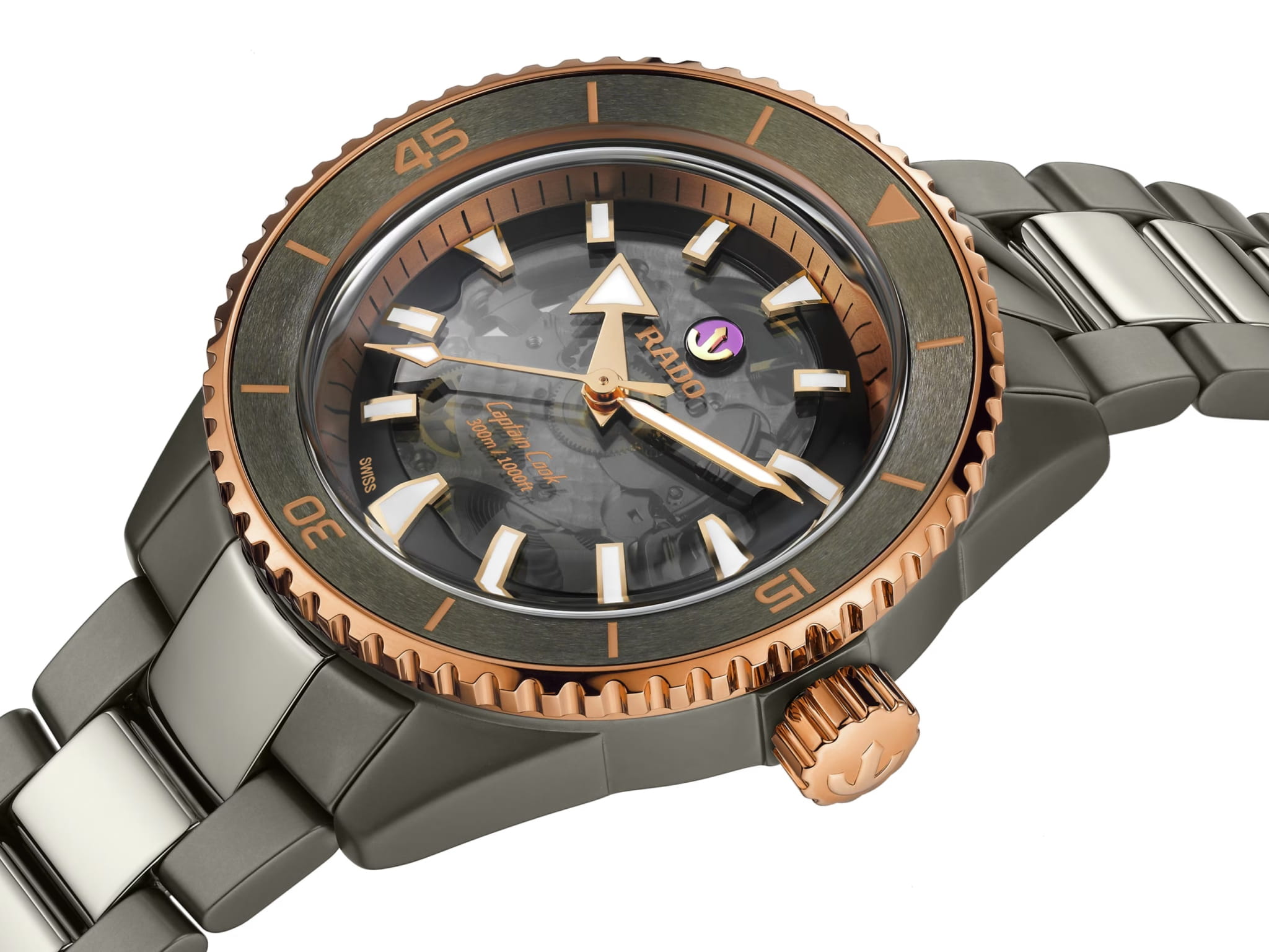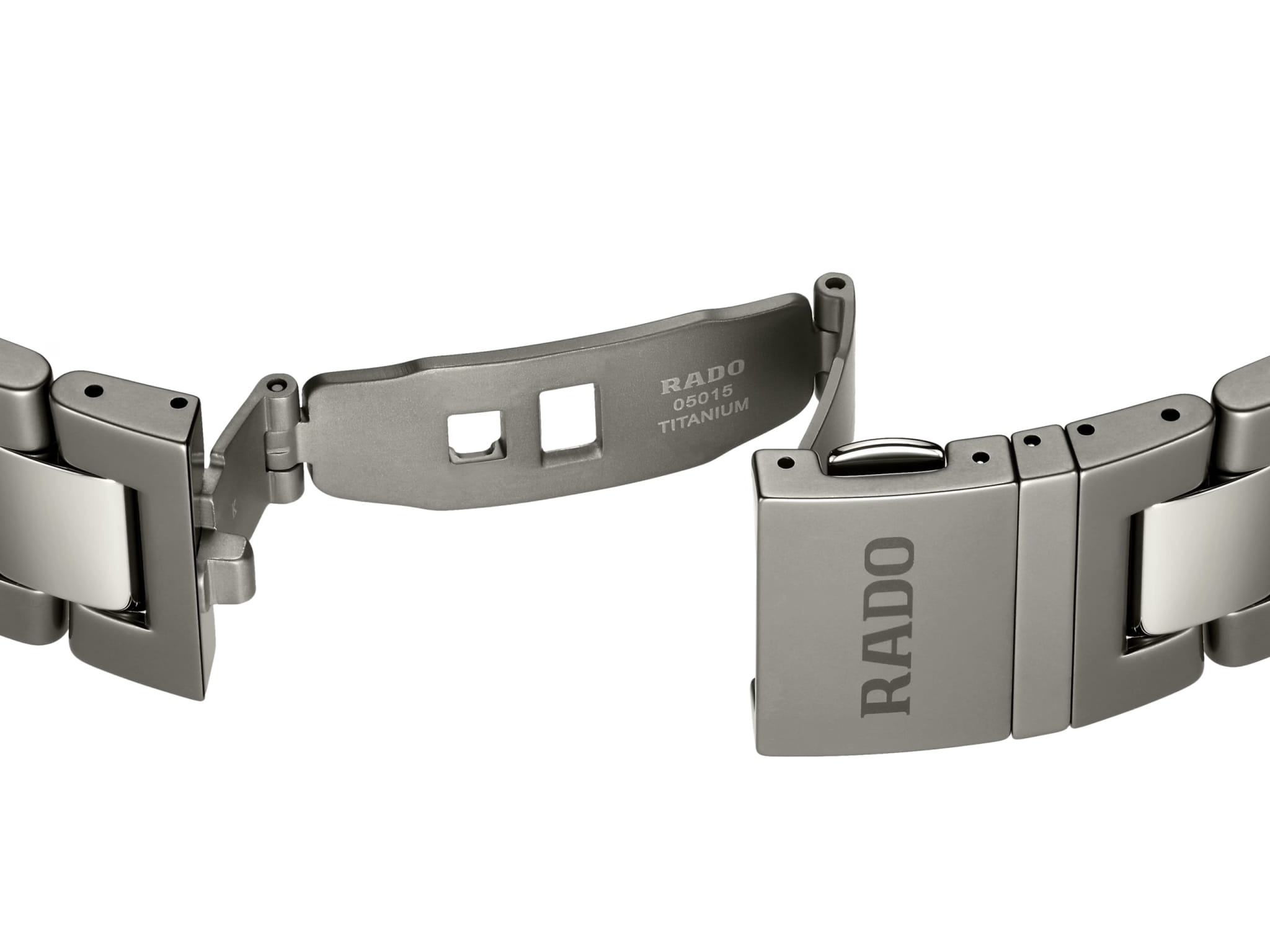Мужские механические часы-скелетоны с автоматическим механизмом Rado Captain Cook Automatic R32128162. Корпус часов изготовлен из титана. Сапфировое стеклоСапфировое стеклоПрочный и надёжный материал из кристалла сапфира синтетического происхождения, характеризующийся особой твёрдостью и устойчивостью к царапинам и повреждениям. с антибликовым покрытиемАнтибликовое покрытиеСлой оксида металла в 0,13-0,3 микрон, благодаря которому стекло часов не бликует и не отражает свет. Антибликовое покрытие уменьшает отражение света в 10 раз, обеспечивая отличную читаемость показателей циферблата., устойчивое к мелким механическим повреждениям. Браслет из титана и высокотехнологичной плазменной керамикиВысокотехнологичная плазменная керамикаИнновационный материал, технология запатентована. Выплавление керамики осуществляется в печи при 20 000 °C, белоснежный материал под воздействием ультравысокой температуры приобретает уникальный блеск, присущий металлам. на раскладной застёжкеРаскладная застёжкаТакой тип застёжки используется только на браслетах из металла. Она никогда не раскрывается полностью, происходит разделение на 2 и более частей. Раскладывающая застёжка снизит вероятность потери часов к минимуму.. Класс водозащиты: 300 метров, позволит плавать, нырять и заниматься другими водными видами спорта. Вращающийся безельБезельВнешний ободок, закрепляющий стекло. В спортивных часах так называется поворотное кольцо с делениями на циферблате, выполняет роль таймера – замеряет отрезки времени на шкале. Неподвижный безель – элемент декора. Однонаправленно вращающийся безель на дайверских часах позволяет фиксировать моменты погружения и выныривания на поверхность. с PVD-покрытиемPVDУльтратонкое покрытие наносится в технике вакуумного напыления, сочетает в себе нитрид титана особой прочности со слоем золота или оксида хрома. Несёт в себе декоративную или защитную функцию.. Стрелки и метки с люминесцентным покрытиемЛюминесцентное покрытиеПозволяет считывать показания времени в темноте. Производители наносят на стрелки, часовые индексы, безель или поверхность циферблата светонакопительный состав, дающий холодное свечение.. Окошко даты находится в положении 3 часа.