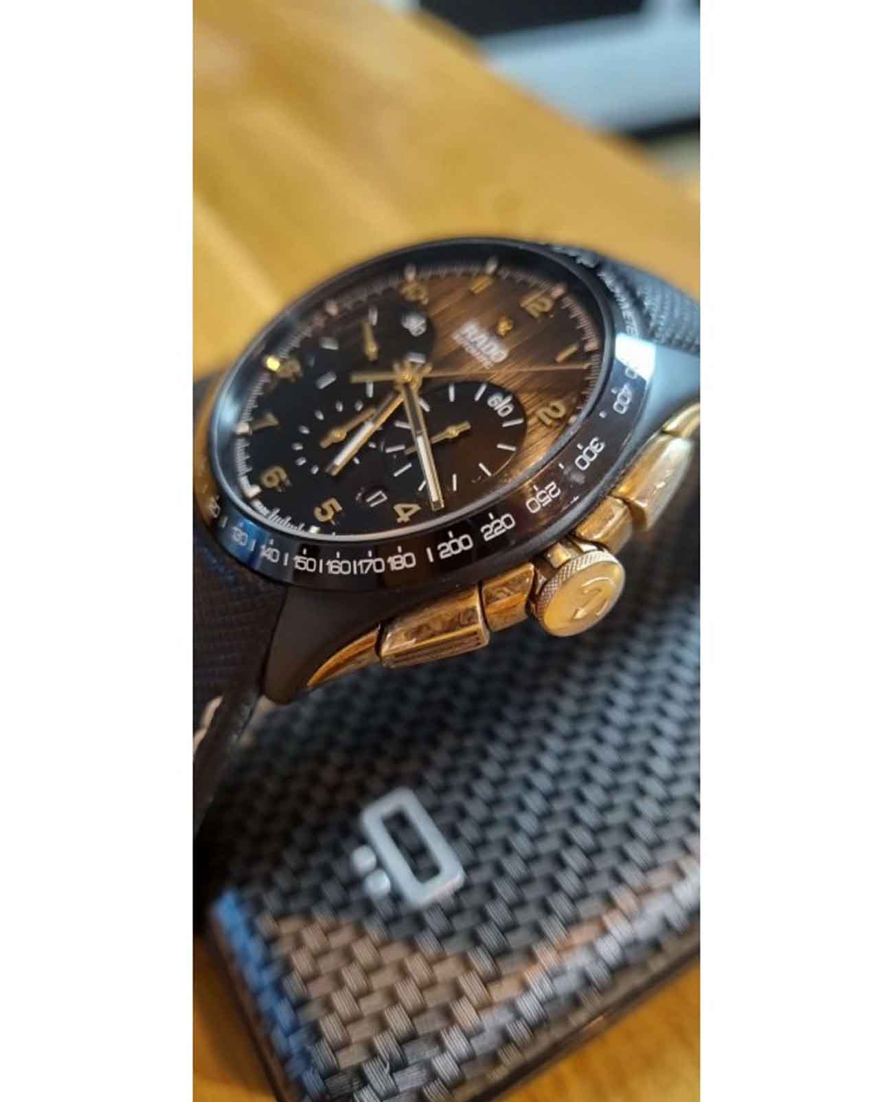 Мужские швейцарские часы-хронографХронографФункция позволяет измерять отрезки времени с особой точностью: часы, минуты, секунды. Верным признаком хронографа является наличие на циферблате 3 дополнительных окошек-счётчиков. Rado HyperChrome Automatic Chronograph R32168156. Корпус часов изготовлен из нержавеющей стали с PVD-покрытиемPVDУльтратонкое покрытие наносится в технике вакуумного напыления, сочетает в себе нитрид титана особой прочности со слоем золота или оксида хрома. Несёт в себе декоративную или защитную функцию. и высокотехнологичной керамикиВысокотехнологичная керамикаИнновационный запатентованный Rado материал с гладкой или матовой поверхностью. Керамика за счёт кристаллической структуры обладает повышенной устойчивостью от возникновения царапин. Материал способен принимать температуру тела человека, обеспечивая невероятный комфорт при ношении.. Сапфировое стеклоСапфировое стеклоПрочный и надёжный материал из кристалла сапфира синтетического происхождения, характеризующийся особой твёрдостью и устойчивостью к царапинам и повреждениям. устойчивое к мелким механическим повреждениям. БезельБезельВнешний ободок, закрепляющий стекло. В спортивных часах так называется поворотное кольцо с делениями на циферблате, выполняет роль таймера – замеряет отрезки времени на шкале. Неподвижный безель – элемент декора. Однонаправленно вращающийся безель на дайверских часах позволяет фиксировать моменты погружения и выныривания на поверхность. со шкалой тахиметраТахиметрРазмеченная шкала, располагается на ободке или безеле часов. Тахиметр позволяет рассчитать скорость на определённом участке пути, расстояние измеряется в километрах или милях.. Стрелки и метки с люминесцентным покрытиемЛюминесцентное покрытиеПозволяет считывать показания времени в темноте. Производители наносят на стрелки, часовые индексы, безель или поверхность циферблата светонакопительный состав, дающий холодное свечение.. Окошко даты находится в положении между 4 и 5 часов. Класс водозащиты: 50 метров, позволит защитить корпус от случайных брызг или капель дожд. Кожаный ремешок на раскладной застёжкеРаскладная застёжкаТакой тип застёжки используется только на браслетах из металла. Она никогда не раскрывается полностью, происходит разделение на 2 и более частей. Раскладывающая застёжка снизит вероятность потери часов к минимуму..