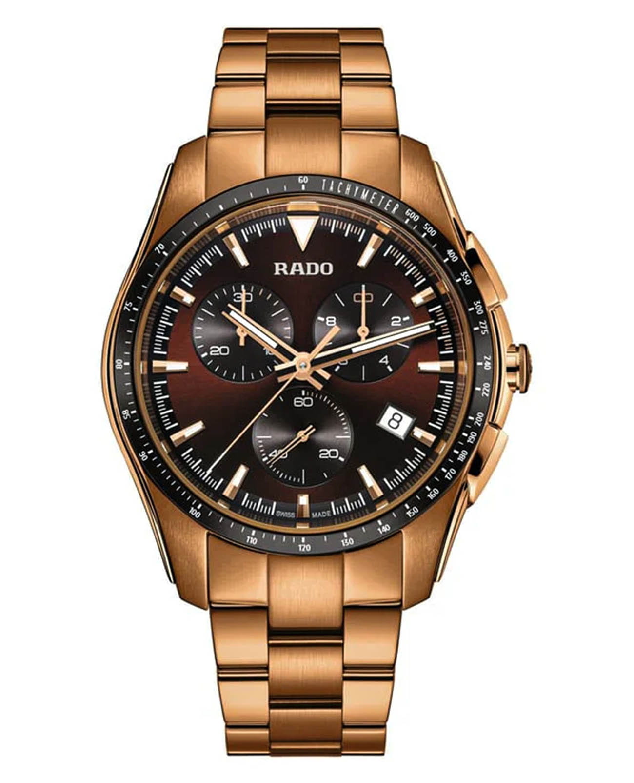 Мужские наручные часы-хронографХронографФункция позволяет измерять отрезки времени с особой точностью: часы, минуты, секунды. Верным признаком хронографа является наличие на циферблате 3 дополнительных окошек-счётчиков. Rado Hyperchrome Chronograph. Корпус часов изготовлен из нержавеющей стали с PVD-покрытиемPVDУльтратонкое покрытие наносится в технике вакуумного напыления, сочетает в себе нитрид титана особой прочности со слоем золота или оксида хрома. Несёт в себе декоративную или защитную функцию.. Стальной браслет с PVD-покрытиемPVDУльтратонкое покрытие наносится в технике вакуумного напыления, сочетает в себе нитрид титана особой прочности со слоем золота или оксида хрома. Несёт в себе декоративную или защитную функцию. на застёжкой «бабочка» с кнопкамиЗастёжка "бабочка"Такой вид застёжки дополняется предохранителями, помогающими избежать случайного раскрытия браслета. Обладают изящным исполнением. . БезельБезельВнешний ободок, закрепляющий стекло. В спортивных часах так называется поворотное кольцо с делениями на циферблате, выполняет роль таймера – замеряет отрезки времени на шкале. Неподвижный безель – элемент декора. Однонаправленно вращающийся безель на дайверских часах позволяет фиксировать моменты погружения и выныривания на поверхность. со шкалой тахиметраТахиметрРазмеченная шкала, располагается на ободке или безеле часов. Тахиметр позволяет рассчитать скорость на определённом участке пути, расстояние измеряется в километрах или милях.. Окошко даты находится в положении 4 часа. Стрелки и метки с люминесцентным покрытиемЛюминесцентное покрытиеПозволяет считывать показания времени в темноте. Производители наносят на стрелки, часовые индексы, безель или поверхность циферблата светонакопительный состав, дающий холодное свечение.. Сапфировое стеклоСапфировое стеклоПрочный и надёжный материал из кристалла сапфира синтетического происхождения, характеризующийся особой твёрдостью и устойчивостью к царапинам и повреждениям. с антибликовым покрытиемАнтибликовое покрытиеСлой оксида металла в 0,13-0,3 микрон, благодаря которому стекло часов не бликует и не отражает свет. Антибликовое покрытие уменьшает отражение света в 10 раз, обеспечивая отличную читаемость показателей циферблата. устойчивое к мелким механическим повреждениям. Класс водозащиты: 100 метров, позволит плавать, нырять и заниматься другими водными видами спорта.
