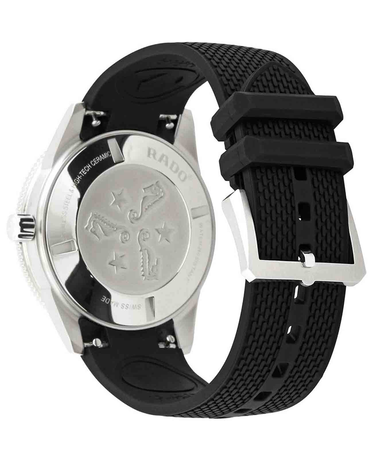 Вращающийся безельБезельВнешний ободок, закрепляющий стекло. В спортивных часах так называется поворотное кольцо с делениями на циферблате, выполняет роль таймера – замеряет отрезки времени на шкале. Неподвижный безель – элемент декора. Однонаправленно вращающийся безель на дайверских часах позволяет фиксировать моменты погружения и выныривания на поверхность. изготовлен из комбинации стали и высокотехнологичной керамикиВысокотехнологичная керамикаИнновационный запатентованный Rado материал с гладкой или матовой поверхностью. Керамика за счёт кристаллической структуры обладает повышенной устойчивостью от возникновения царапин. Материал способен принимать температуру тела человека, обеспечивая невероятный комфорт при ношении., что придает ему особую прочность и устойчивость к износу. Керамическая вставка также добавляет часам визуальной выразительности.