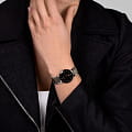 БезельБезельВнешний ободок, закрепляющий стекло. В спортивных часах так называется поворотное кольцо с делениями на циферблате, выполняет роль таймера – замеряет отрезки времени на шкале. Неподвижный безель – элемент декора. Однонаправленно вращающийся безель на дайверских часах позволяет фиксировать моменты погружения и выныривания на поверхность. выполнен из стали с PVD-покрытиемPVDУльтратонкое покрытие наносится в технике вакуумного напыления, сочетает в себе нитрид титана особой прочности со слоем золота или оксида хрома. Несёт в себе декоративную или защитную функцию., что придаёт часам изысканный блеск и дополнительную защиту от износа. Окошко даты расположено в положении 6 часов, предоставляющее удобный доступ к актуальной дате. Циферблат инкрустирован бриллиантами, что добавляет часам нотку роскоши и изысканности.