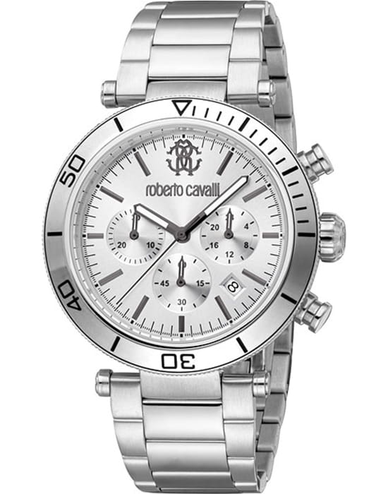 Roberto Cavalli Ritmo RC5G128M0045 — мужская кварцевая модель с ярко выраженным спортивным стилем и практичным функционалом, сочетающая строгий дизайн и надёжность. Корпус диаметром 43 мм и толщиной 12 мм выполнен из нержавеющей стали, защищён прочным минеральным стекломМинеральное стеклоМинеральное стекло представляет собой искусственно выращенный минерал кварца. Такое стекло отличается особой устойчивостью к повреждениям и царапинам. Уступает по некоторым качествам сапфировому стеклу., устойчивым к повседневным повреждениям и сохраняющим хорошую читаемость циферблата. БезельБезельВнешний ободок, закрепляющий стекло. В спортивных часах так называется поворотное кольцо с делениями на циферблате, выполняет роль таймера – замеряет отрезки времени на шкале. Неподвижный безель – элемент декора. Однонаправленно вращающийся безель на дайверских часах позволяет фиксировать моменты погружения и выныривания на поверхность.. Водозащита 100 м делает часы надёжным спутником во время плавания и активного отдыха. Функциональность поддерживается индикаторами хронографаХронографФункция позволяет измерять отрезки времени с особой точностью: часы, минуты, секунды. Верным признаком хронографа является наличие на циферблате 3 дополнительных окошек-счётчиков. и даты, которые органично вписаны в оформление циферблата. Стальной браслет на застёжке-бабочке с кнопкамиЗастёжка "бабочка"Такой вид застёжки дополняется предохранителями, помогающими избежать случайного раскрытия браслета. Обладают изящным исполнением. обеспечивает комфортную посадку и долговечность, а также гармонично завершает образ модели, которая одинаково хорошо подойдёт как для динамичного повседневного ритма, так и для более строгих ситуаций.