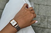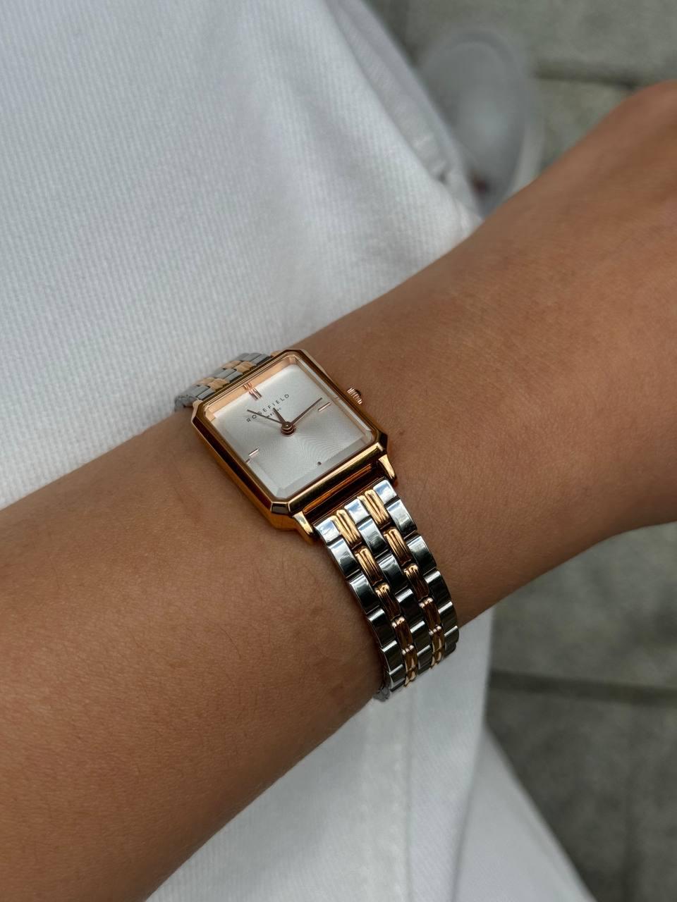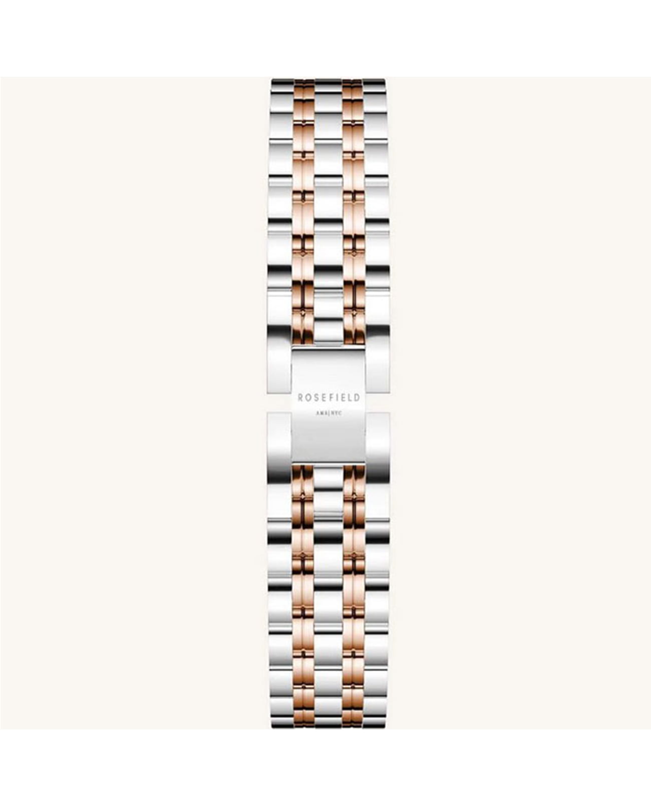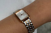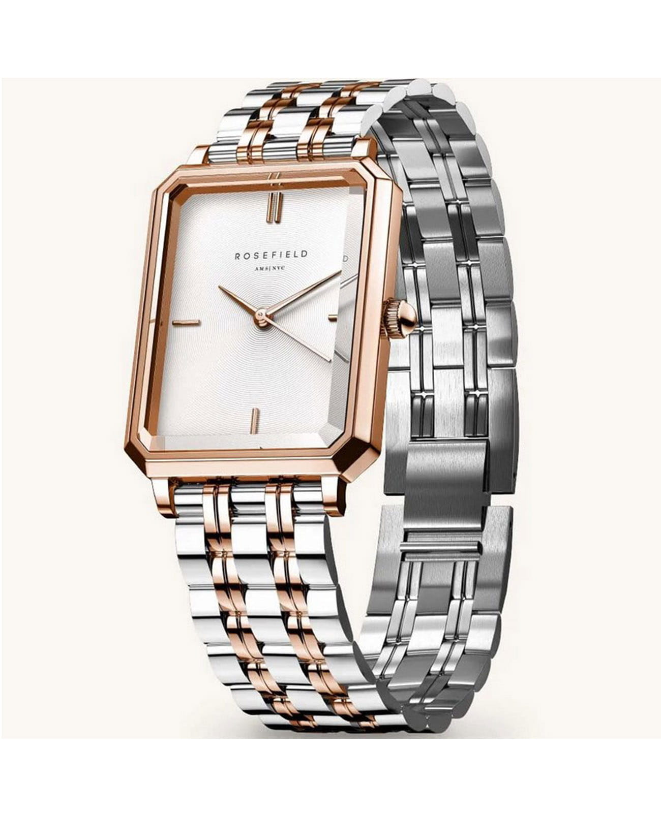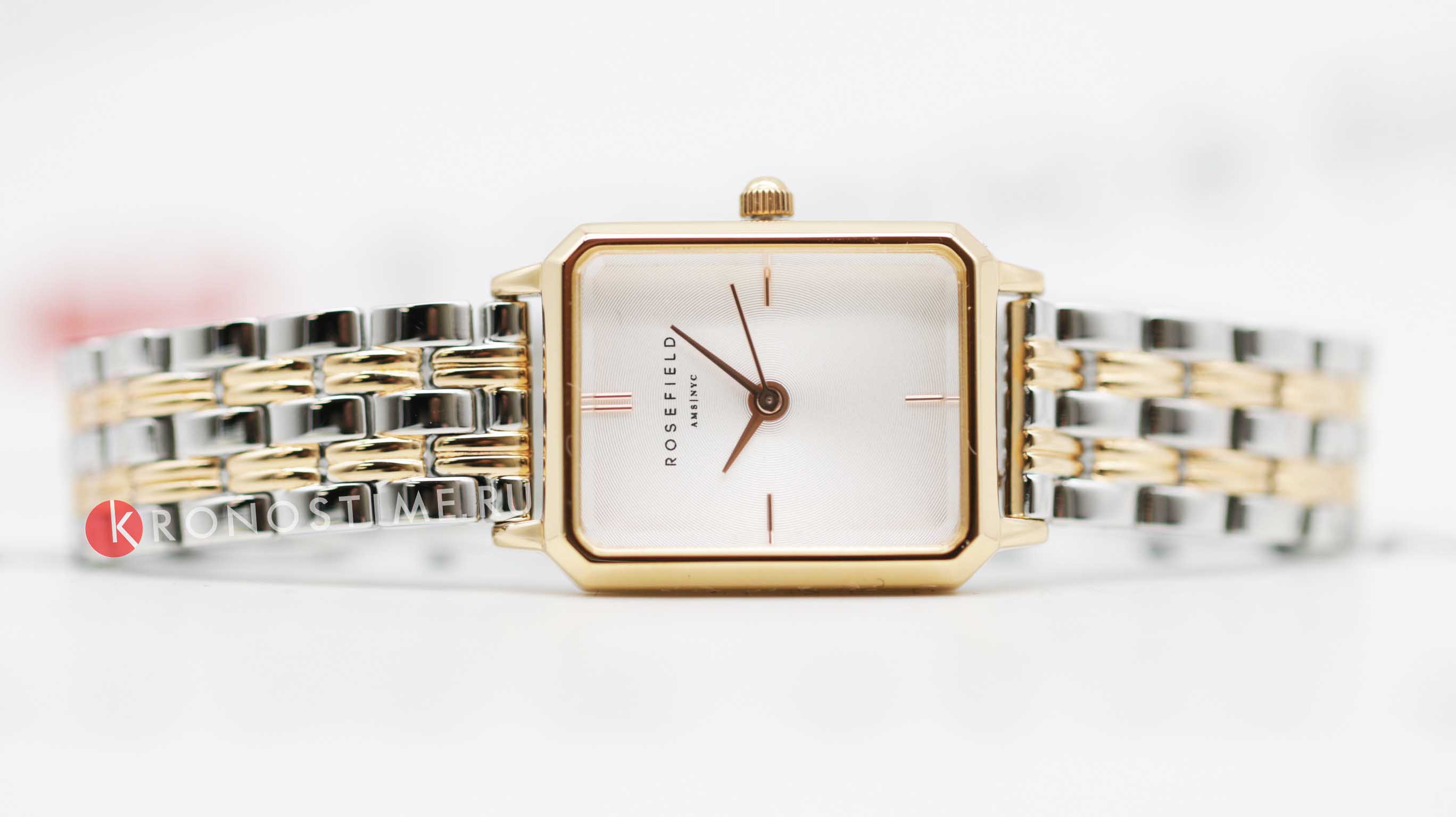 Женские кварцевые часы. Центральные часовая, минутная и секундная стрелки. Серебристый циферблат. Восьмиугольный корпус выполнен из металла с IP покрытием цвета розового золота. Размер корпуса составляет 19,5 х 24 мм, толщина 7 мм. Стальной браслет с частичным покрытием, браслетная застежка. Прочное минеральное стекло устойчивое к мелким механическим повреждениям. Водостойкость WR 30 (брызги).