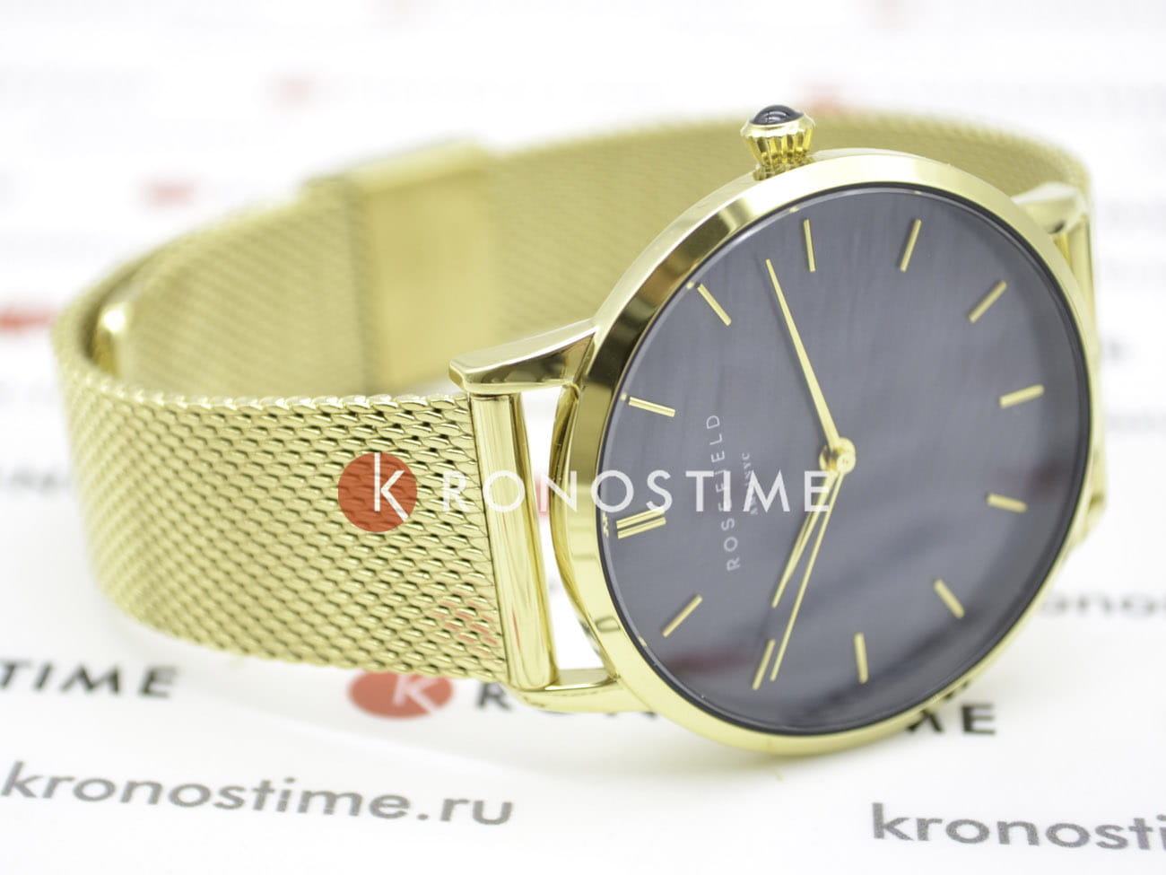 Женские кварцевые часы Rosefield RBGMG-R07. Черный перламутровый циферблат. Круглый корпус выполнен из металла с IP покрытием цвета желтого золота. Диаметр корпуса составляет 36 мм, толщина 7,5 мм. Стальной браслет с покрытием выполнен в технике миланского плетения, раскладная застежка. Прочное минеральное стекло устойчивое к мелким механическим повреждениям. Водостойкость WR 30 (брызги).