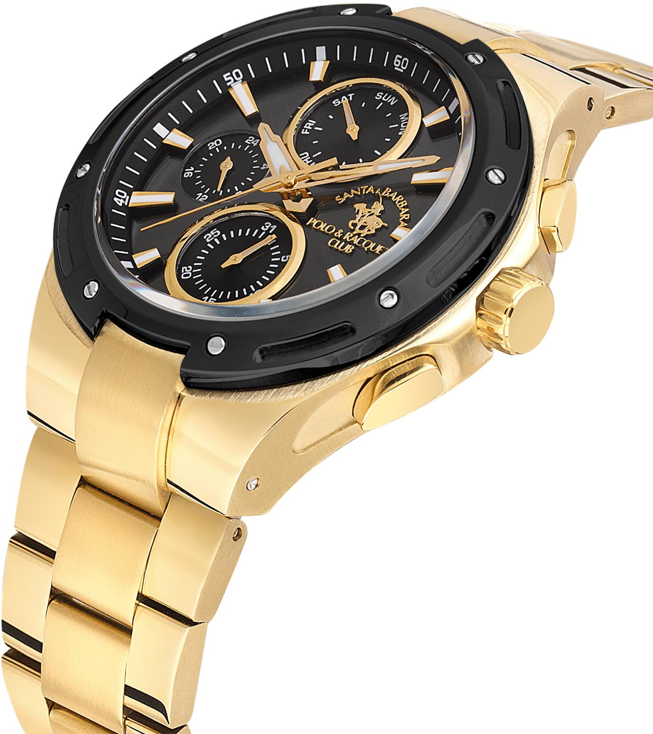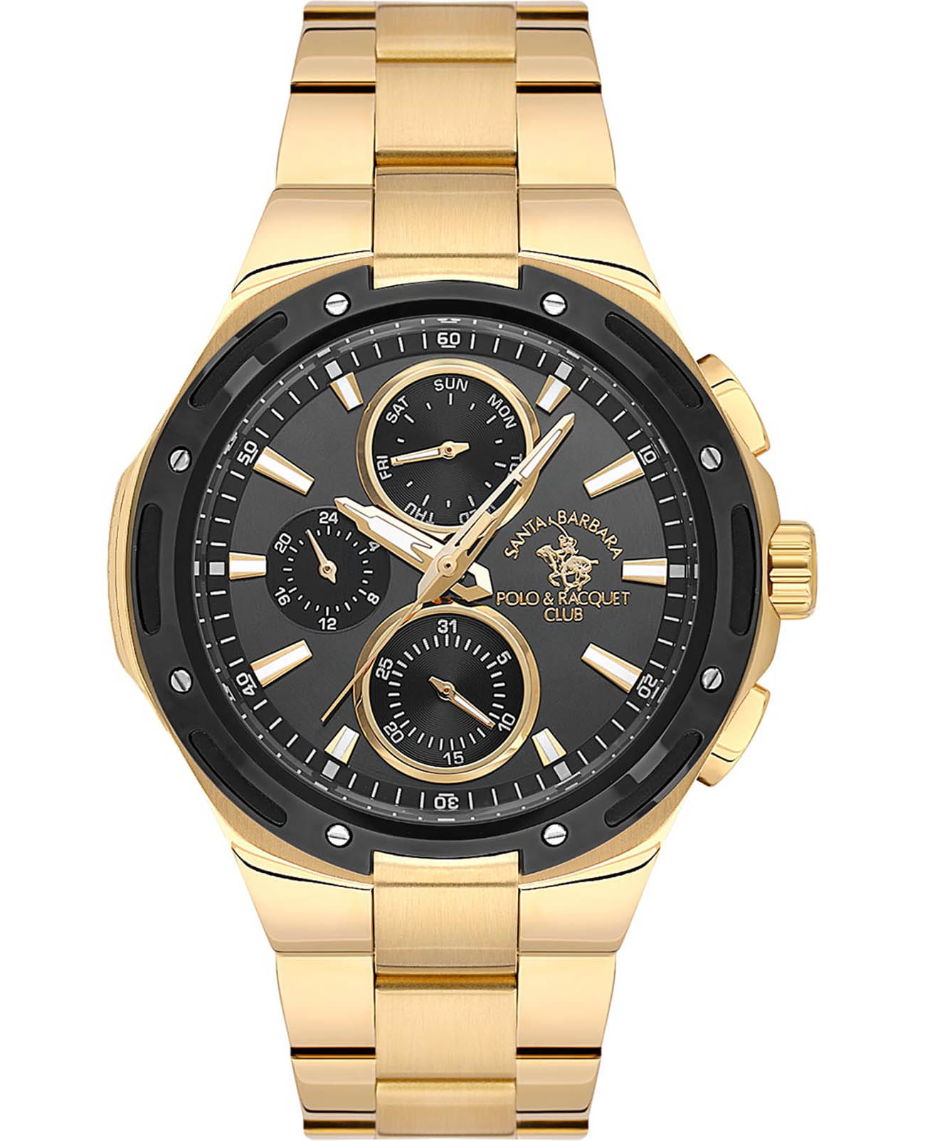Мужские кварцевые часы Santa Barbara Polo & Racquet Club — это эффектный и функциональный аксессуар. Корпус диаметром 44 мм выполнен из нержавеющей стали с IP-покрытиемIP-покрытиеМетод ионного напыления. Демонстрирует повышенную устойчивость к истиранию, окислению и химическим веществам. Под воздействием высокого давления и температуры около 1500°C молекулы металла надёжно соединяются с частицами корпуса часов.. Циферблат чёрного цвета оформлен по технологии Sunray («солнечные лучи»), дополнен накладными метками в виде штрихов и фирменным логотипом. Указатели дня недели и даты вынесены на отдельные субциферблаты, также присутствует индикация 24-часового формата времени. Стрелки заострённые, прямоугольные, в стиле Baton, с люминесцентным покрытиемЛюминесцентное покрытиеПозволяет считывать показания времени в темноте. Производители наносят на стрелки, часовые индексы, безель или поверхность циферблата светонакопительный состав, дающий холодное свечение., обеспечивающим хорошую читаемость в темноте. Метки также имеют люминесцентное покрытие. Циферблат защищён минеральным стекломМинеральное стеклоМинеральное стекло представляет собой искусственно выращенный минерал кварца. Такое стекло отличается особой устойчивостью к повреждениям и царапинам. Уступает по некоторым качествам сапфировому стеклу.. Часы оснащены стальным браслетом из нержавеющей стали с IP-покрытиемIP-покрытиеМетод ионного напыления. Демонстрирует повышенную устойчивость к истиранию, окислению и химическим веществам. Под воздействием высокого давления и температуры около 1500°C молекулы металла надёжно соединяются с частицами корпуса часов.. с раскладной застёжкойРаскладная застёжкаТакой тип застёжки используется только на браслетах из металла. Она никогда не раскрывается полностью, происходит разделение на 2 и более частей. Раскладывающая застёжка снизит вероятность потери часов к минимуму.. Водонепроницаемость 50 м позволяет использовать часы в повседневных условиях. Идеальный выбор для тех, кто ценит стиль, точность и надёжность.