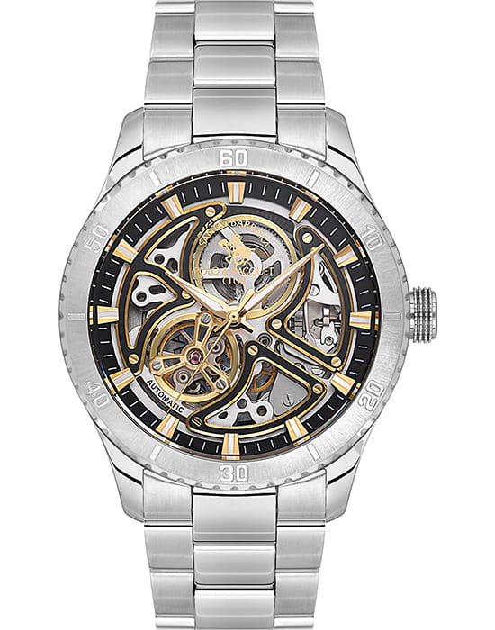 Мужские механические часы с автоподзаводом Santa Barbara Polo & Racquet Club Luxury — это стильный и функциональный аксессуар для современного джентльмена. Изысканный корпус из стали 316L диаметром 42.5 мм. Изящный скелетонизированный циферблат украшен фирменным логотипом, с метками. Накладные лаконичные метки и стрелки с люминесцентным покрытиемЛюминесцентное покрытиеПозволяет считывать показания времени в темноте. Производители наносят на стрелки, часовые индексы, безель или поверхность циферблата светонакопительный состав, дающий холодное свечение., обеспечивающим хорошую читаемость в темноте. Циферблат защищён минеральным стекломМинеральное стеклоМинеральное стекло представляет собой искусственно выращенный минерал кварца. Такое стекло отличается особой устойчивостью к повреждениям и царапинам. Уступает по некоторым качествам сапфировому стеклу., устойчивым к царапинам и механическим повреждениям. Стальной браслет на застёжке-бабочке с кнопкамиЗастёжка "бабочка"Такой вид застёжки дополняется предохранителями, помогающими избежать случайного раскрытия браслета. Обладают изящным исполнением. обеспечивает комфортное и безопасное ношение. Водонепроницаемость 50 м позволяет использовать часы в повседневных условиях. Идеальный выбор для тех, кто ценит элегантность, точность и надёжность.