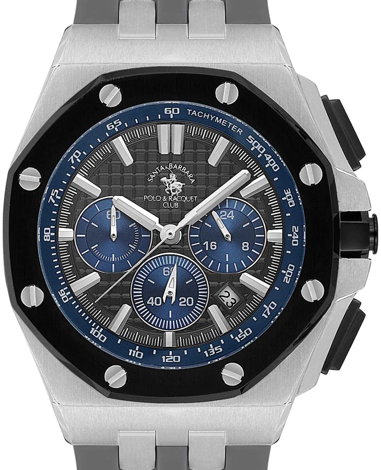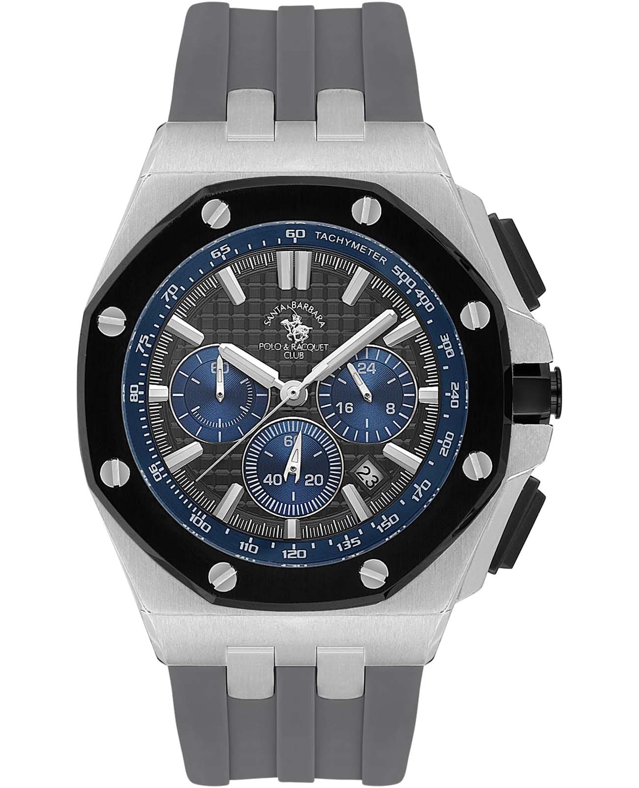 Мужские кварцевые часы-хронографХронографФункция позволяет измерять отрезки времени с особой точностью: часы, минуты, секунды. Верным признаком хронографа является наличие на циферблате 3 дополнительных окошек-счётчиков. с секундомеромСекундомерСекундоме́р — прибор, способный измерять интервалы времени с точностью до долей секунды. Santa Barbara Polo & Racquet Club SB.1.10601-4 — воплощение элегантности и технического совершенства. Корпус из нержавеющей стали, диаметром 44,5 мм, что делает их устойчивыми к внешним воздействиям и придает благородный вид. Стрелки и метки с люминесцентным покрытиемЛюминесцентное покрытиеПозволяет считывать показания времени в темноте. Производители наносят на стрелки, часовые индексы, безель или поверхность циферблата светонакопительный состав, дающий холодное свечение., обеспечивающим хорошую читаемость в темноте. Неподвижный безельБезельВнешний ободок, закрепляющий стекло. В спортивных часах так называется поворотное кольцо с делениями на циферблате, выполняет роль таймера – замеряет отрезки времени на шкале. Неподвижный безель – элемент декора. Однонаправленно вращающийся безель на дайверских часах позволяет фиксировать моменты погружения и выныривания на поверхность. с IP-покрытиемIP-покрытиеМетод ионного напыления. Демонстрирует повышенную устойчивость к истиранию, окислению и химическим веществам. Под воздействием высокого давления и температуры около 1500°C молекулы металла надёжно соединяются с частицами корпуса часов. черного цвета. Циферблат защищён минеральным стекломМинеральное стеклоМинеральное стекло представляет собой искусственно выращенный минерал кварца. Такое стекло отличается особой устойчивостью к повреждениям и царапинам. Уступает по некоторым качествам сапфировому стеклу. устойчивое к царапинам и механическим повреждениям. Окошко даты находится в положении между отметками 4 и 5 часов, тахиметрТахиметрРазмеченная шкала, располагается на ободке или безеле часов. Тахиметр позволяет рассчитать скорость на определённом участке пути, расстояние измеряется в километрах или милях. по внешнему краю. Силиконовый ремешок на стандартной застёжке обеспечивает комфортное и безопасное ношение. Водонепроницаемость 50 метров позволит защитить корпус от случайных брызг или капель дождя. Идеальный выбор для тех, кто ценит элегантный дизайн и качество.