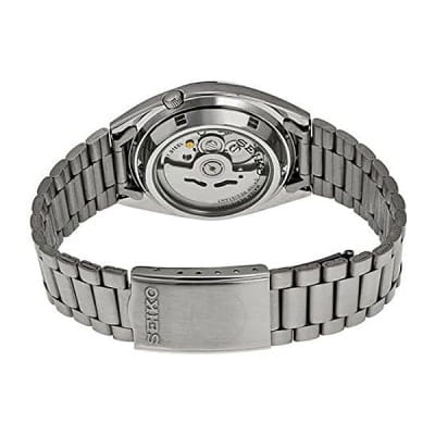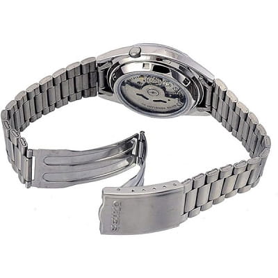 Мужские японские часы с запасом хода 45 часов Seiko 5 SNXS75K1 с минеральным стекломМинеральное стеклоМинеральное стекло представляет собой искусственно выращенный минерал кварца. Такое стекло отличается особой устойчивостью к повреждениям и царапинам. Уступает по некоторым качествам сапфировому стеклу. повышенной прочности Hardlex, механический механизм (автоматический калибр) с высокой точностью. Класс водозащиты: 30 метров, позволит защитить корпус от случайных брызг или капель дождя. Корпус и браслет часов изготовлен из стали. Браслет на раскладной застёжкеРаскладная застёжкаТакой тип застёжки используется только на браслетах из металла. Она никогда не раскрывается полностью, происходит разделение на 2 и более частей. Раскладывающая застёжка снизит вероятность потери часов к минимуму. с кнопками. Окошко даты и дня недели находятся в положении 3 часа. Заводная коронка находится на «4 часах». Стрелки и метки с люминесцентным покрытиемЛюминесцентное покрытиеПозволяет считывать показания времени в темноте. Производители наносят на стрелки, часовые индексы, безель или поверхность циферблата светонакопительный состав, дающий холодное свечение..
