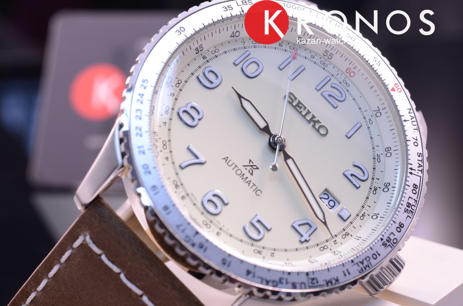 Работу часов обеспечивает японский пружинный механизм 4R35 с возможностью автоматического и ручного завода. Запас хода калибра рассчитан на 40 часов. Вращающийся безельБезельВнешний ободок, закрепляющий стекло. В спортивных часах так называется поворотное кольцо с делениями на циферблате, выполняет роль таймера – замеряет отрезки времени на шкале. Неподвижный безель – элемент декора. Однонаправленно вращающийся безель на дайверских часах позволяет фиксировать моменты погружения и выныривания на поверхность. дополнен логарифмической линейкой, на стрелки нанесено люминесцентное покрытиеЛюминесцентное покрытиеПозволяет считывать показания времени в темноте. Производители наносят на стрелки, часовые индексы, безель или поверхность циферблата светонакопительный состав, дающий холодное свечение.. Ремешок изготовлен из натуральной телячьей кожи, минеральное стекло Hardlex отличается повышенной устойчивостью к царапинам.
