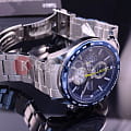 Часы-хронограф с секундомером и тахиметром. Секундомер до 12ч, точность 1/5с. Завинчивающаяся задняя крышка.