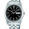 Мужские кварцевые часы Seiko — это элегантный аксессуар в классическом стиле. Корпус размером 38 мм и толщиной 8 мм выполнен из нержавеющей стали. Циферблат чёрного цвета оформлен индексами и стрелками. Указатели дня недели и даты вынесены на отдельные субциферблаты. Стрелки и метки с люминесцентным покрытиемЛюминесцентное покрытиеПозволяет считывать показания времени в темноте. Производители наносят на стрелки, часовые индексы, безель или поверхность циферблата светонакопительный состав, дающий холодное свечение., обеспечивающим хорошую читаемость в темноте. Циферблат защищён прочным защищён минеральным стекломМинеральное стеклоМинеральное стекло представляет собой искусственно выращенный минерал кварца. Такое стекло отличается особой устойчивостью к повреждениям и царапинам. Уступает по некоторым качествам сапфировому стеклу. от компании Seiko. Часы оснащены стальным браслетом с раскладной застёжкойРаскладная застёжкаТакой тип застёжки используется только на браслетах из металла. Она никогда не раскрывается полностью, происходит разделение на 2 и более частей. Раскладывающая застёжка снизит вероятность потери часов к минимуму.. Водонепроницаемость 30 м позволяет использовать часы в повседневных условиях. Идеальный выбор для тех, кто ценит японское качество и лаконичный дизайн.
