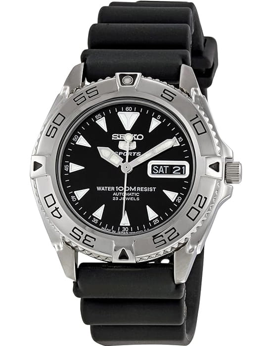 Мужские японские часы с запасом хода 45 часов Seiko 5 Sports SNZB33J2 с минеральным стекломМинеральное стеклоМинеральное стекло представляет собой искусственно выращенный минерал кварца. Такое стекло отличается особой устойчивостью к повреждениям и царапинам. Уступает по некоторым качествам сапфировому стеклу. повышенной прочности Hardlex, механический механизм (автоматический калибр) с высокой точностью. Класс водозащиты: 100 метров, позволит плавать, нырять и заниматься другими водными видами спорта. Корпус часов изготовлен из стали. Полимерный ремешок на стандартной застежке. Окошко даты и дня недели находятся в положении 3 часа. Заводная коронка находится на «3 часах». Стрелки и метки с люминесцентным покрытиемЛюминесцентное покрытиеПозволяет считывать показания времени в темноте. Производители наносят на стрелки, часовые индексы, безель или поверхность циферблата светонакопительный состав, дающий холодное свечение..