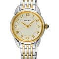 Женские японские часы Seiko Discover More SUR562P1 c кварцевым механизмом с высокой точностью с калибром 6N01. Минеральное стеклоМинеральное стеклоМинеральное стекло представляет собой искусственно выращенный минерал кварца. Такое стекло отличается особой устойчивостью к повреждениям и царапинам. Уступает по некоторым качествам сапфировому стеклу. выпуклое повышенной прочности Hardlex, устойчивое к появлению царапин, обладающее высокой прозрачностью. Водозащита до 5 ATM позволяет не снимать часы при дожде, мытье рук или случайных брызгах. Корпус диаметром 28,7 мм и браслет часов изготовлен из нержавеющей стали с PVDPVDУльтратонкое покрытие наносится в технике вакуумного напыления, сочетает в себе нитрид титана особой прочности со слоем золота или оксида хрома. Несёт в себе декоративную или защитную функцию. покрытием. Циферблат представлен с метками в виде арабских цифр. Браслет с раскладной застёжкойРаскладная застёжкаТакой тип застёжки используется только на браслетах из металла. Она никогда не раскрывается полностью, происходит разделение на 2 и более частей. Раскладывающая застёжка снизит вероятность потери часов к минимуму. с фиксатором. Seiko — это гармония изящного дизайна и технологичной надёжности, компактный и стильный выбор для повседневной классики.