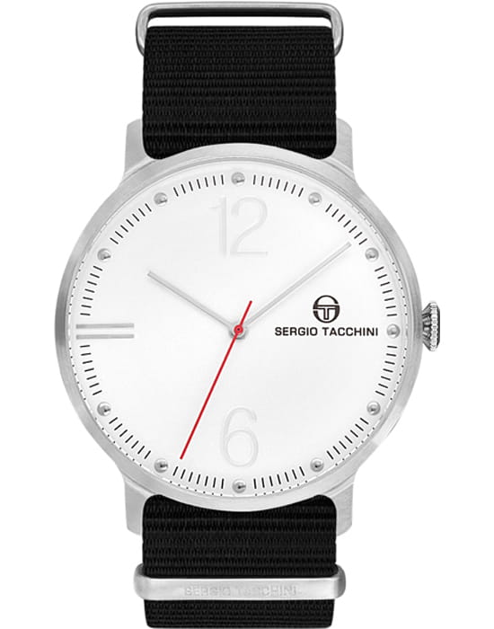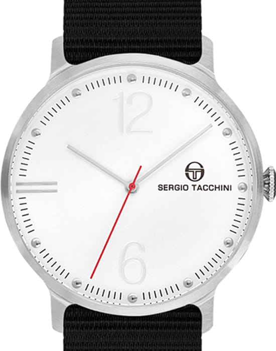 Sergio Tacchini — стильные мужские часы в минималистичном дизайне, подчеркивающем лёгкость и современность образа. Круглый корпус выполнен из нержавеющей стали, а циферблат оформлен крупными арабскими цифрами «6» и «12» и тонкими метками, что делает показания лёгкими для восприятия.