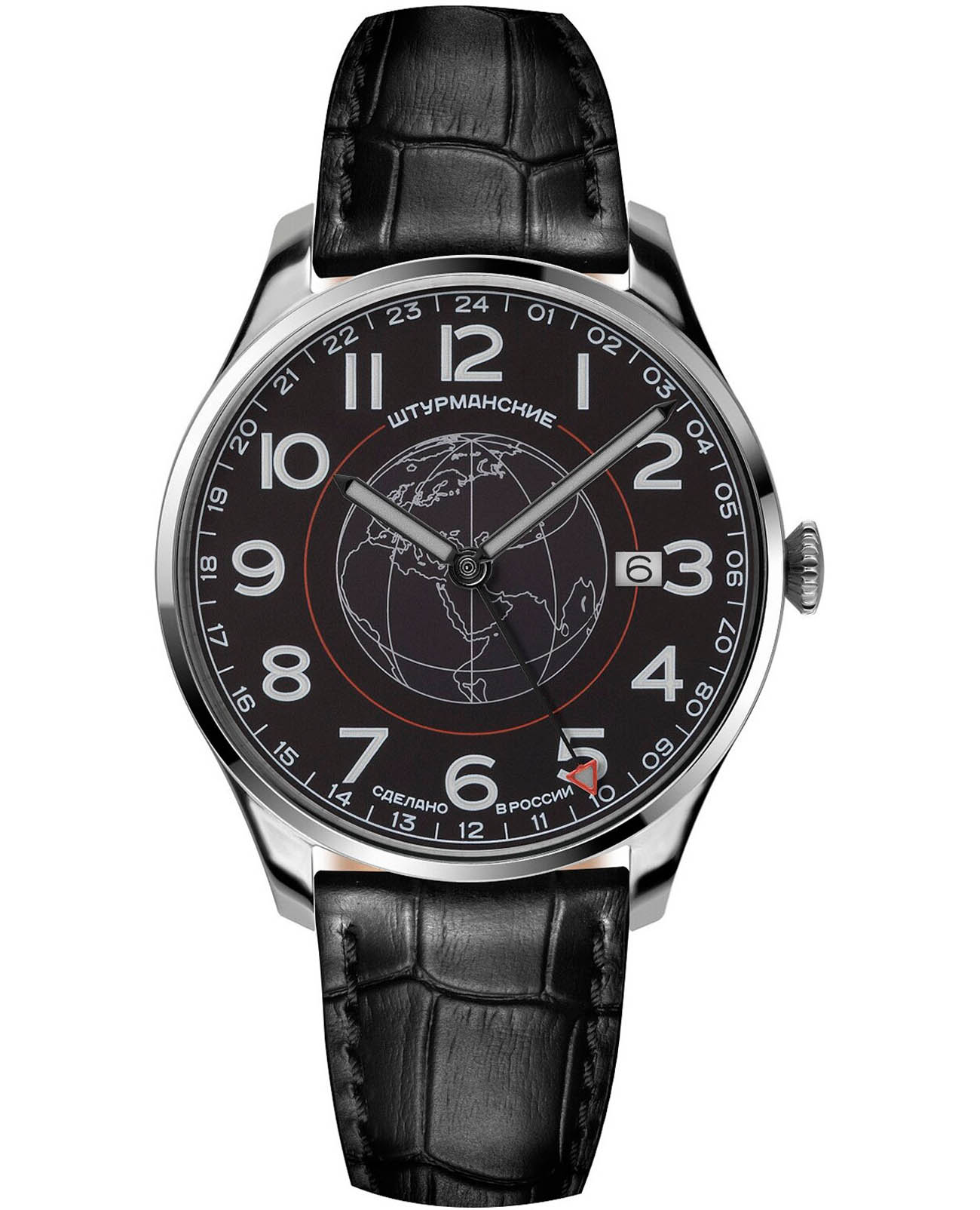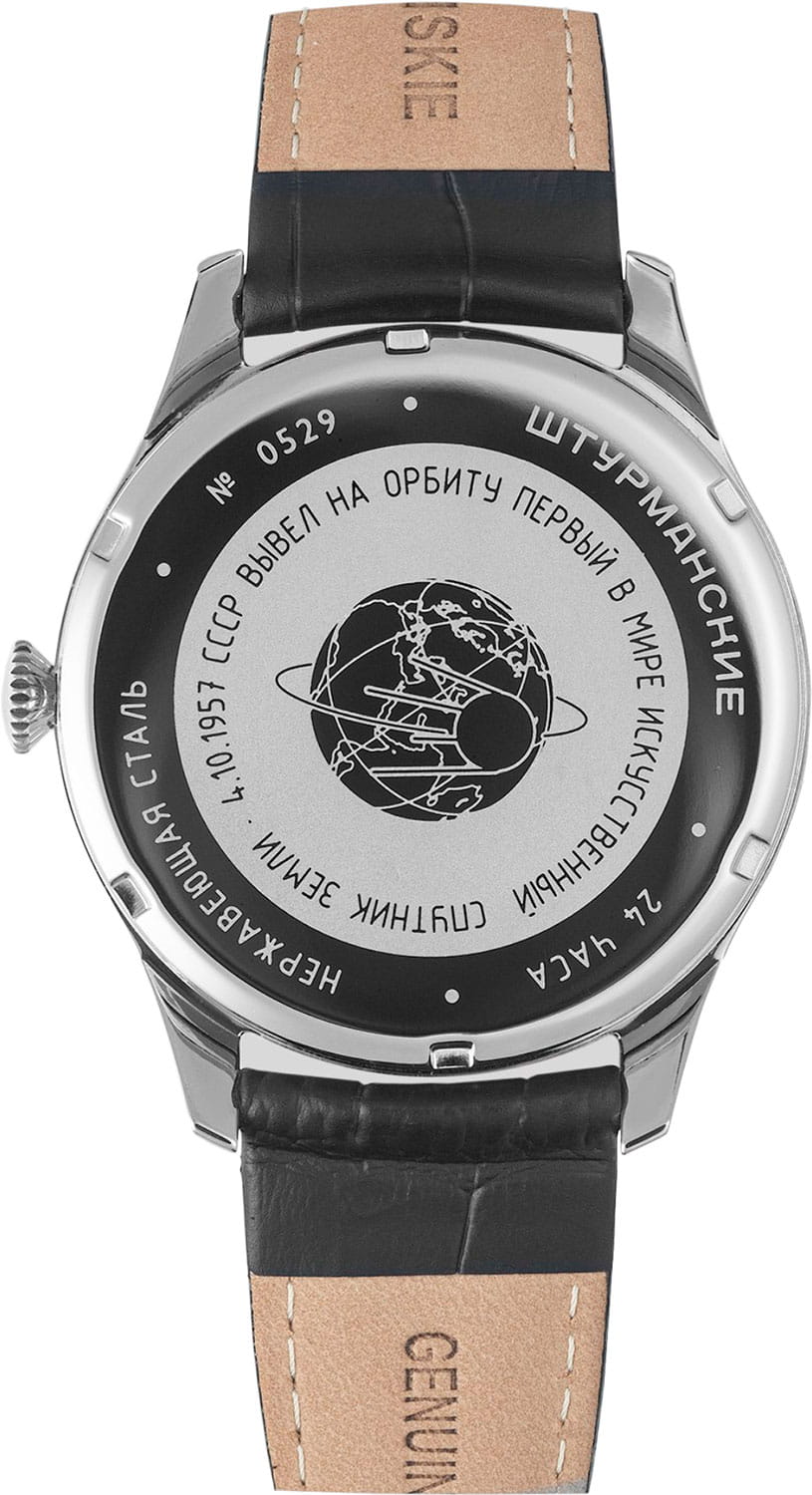 Штурманские мужские российские кварцевые часы с минеральным стекломМинеральное стеклоМинеральное стекло представляет собой искусственно выращенный минерал кварца. Такое стекло отличается особой устойчивостью к повреждениям и царапинам. Уступает по некоторым качествам сапфировому стеклу. кварцевый механизм с высокой точностью. Класс водозащиты: 50 метров, позволит защитить корпус от случайных брызг или капель дождя. Корпус часов изготовлен из стали. Кожаный ремешок на стандартной застёжке. Стрелки и метки с люминесцентным покрытиемЛюминесцентное покрытиеПозволяет считывать показания времени в темноте. Производители наносят на стрелки, часовые индексы, безель или поверхность циферблата светонакопительный состав, дающий холодное свечение.. Окошко даты находится в положении 3 часа.