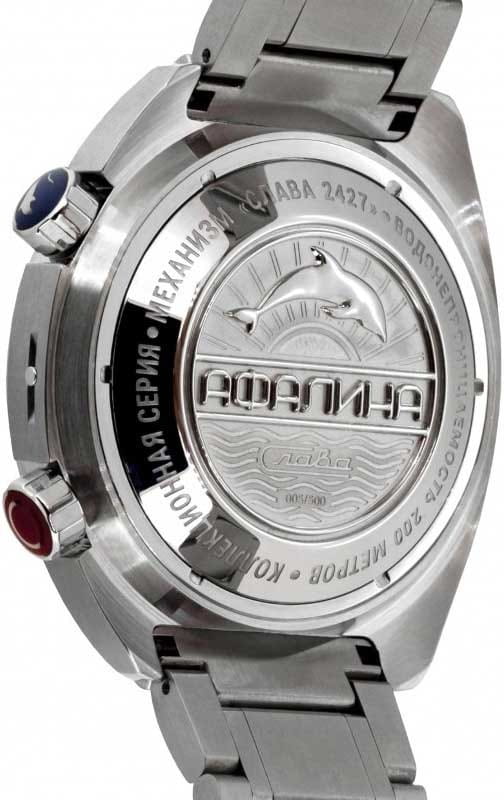 Коллекционные часы Слава Афалина 2430516/100-2427 — это превосходный выбор для тех, кто ценит стиль и функциональность. Модель из лимитированной серии, состоящей всего из 500 экземпляров, отличается прочным стальным корпусом и предназначена для любителей дайвинга. Часы оснащены надежным механическим механизмом с автоподзаводом и водозащитой до 200 метров, что делает их идеальными для подводных приключений. Зеленый циферблат дополняется стрелками с люминесцентным покрытиемЛюминесцентное покрытиеПозволяет считывать показания времени в темноте. Производители наносят на стрелки, часовые индексы, безель или поверхность циферблата светонакопительный состав, дающий холодное свечение. для отличной видимости в условиях низкой освещенности, а сапфировое стеклоСапфировое стеклоПрочный и надёжный материал из кристалла сапфира синтетического происхождения, характеризующийся особой твёрдостью и устойчивостью к царапинам и повреждениям. с антибликовым покрытиемАнтибликовое покрытиеСлой оксида металла в 0,13-0,3 микрон, благодаря которому стекло часов не бликует и не отражает свет. Антибликовое покрытие уменьшает отражение света в 10 раз, обеспечивая отличную читаемость показателей циферблата. защищает от царапин и бликов. Основная заводная головка расположена на корпусе ближе к отметке ''4 часа'', она позволяет настраивать время и заводить часы перед погружением. С помощью второй головки, расположенной у отметки ''2 часа'', можно управлять вращающимся внутренним кольцом безеляБезельВнешний ободок, закрепляющий стекло. В спортивных часах так называется поворотное кольцо с делениями на циферблате, выполняет роль таймера – замеряет отрезки времени на шкале. Неподвижный безель – элемент декора. Однонаправленно вращающийся безель на дайверских часах позволяет фиксировать моменты погружения и выныривания на поверхность. с PVDPVDУльтратонкое покрытие наносится в технике вакуумного напыления, сочетает в себе нитрид титана особой прочности со слоем золота или оксида хрома. Несёт в себе декоративную или защитную функцию. покрытием зеленого цвета и фиксировать его в нужном положении. Окошко даты и дня недели удобно расположено на отметке "3 часа", а профессиональная "дайвинг-застежка" стального браслета имеет удлинение для гидрокостюма. Особая забота о природе: часть средств от продажи данной модели перечисляется в центр спасения дельфинов "Дельфа". Часы серии "Афалина" — это не только функциональный аксессуар, но и символ вашей поддержки благородного дела.