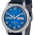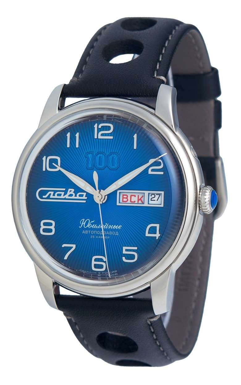 Часы Слава Юбилейные 2600672/300-2427 представляют собой воплощение российского часового искусства, сочетая в себе традиции и современные технологии. Эти механические часы с автоподзаводом оснащены калибром «Слава 2427», который обеспечивает надежную и точную работу. Корпус из высококачественной стали диаметром 44 мм и толщиной 14,5 мм придает часам солидность и долговечность. Циферблат выполнен в благородном синим цвете и оформлен арабскими цифрами, обеспечивая удобство чтения времени. Прочное выпуклое сапфировое стеклоСапфировое стеклоПрочный и надёжный материал из кристалла сапфира синтетического происхождения, характеризующийся особой твёрдостью и устойчивостью к царапинам и повреждениям. защищает циферблат от царапин и повреждений. Особенностью модели является наличие календаря, отображающего число и день недели в положении 3 часа. Стрелки с люминесцентным покрытиемЛюминесцентное покрытиеПозволяет считывать показания времени в темноте. Производители наносят на стрелки, часовые индексы, безель или поверхность циферблата светонакопительный состав, дающий холодное свечение., что облегчает чтение времени даже в условиях слабого освещения. Часы обладают водозащитой уровня 100WR, что делает их подходящими для повседневного ношения и активного образа жизни. Кожаный ремешок с классической застежкой добавляет модели изысканности и комфорта в носке. Эта модель представлена в лимитированной серии из 300 экземпляров, что делает её не только надежным функциональным аксессуаром, но и ценным предметом для коллекционеров. Прозрачная задняя крышка позволяет наблюдать за работой механизма, который включает в себя 25 камней и имеет частоту 18000 полуколебаний в час. Запас хода составляет до 40 часов, а противоударное устройство оси баланса обеспечивает дополнительную надежность.