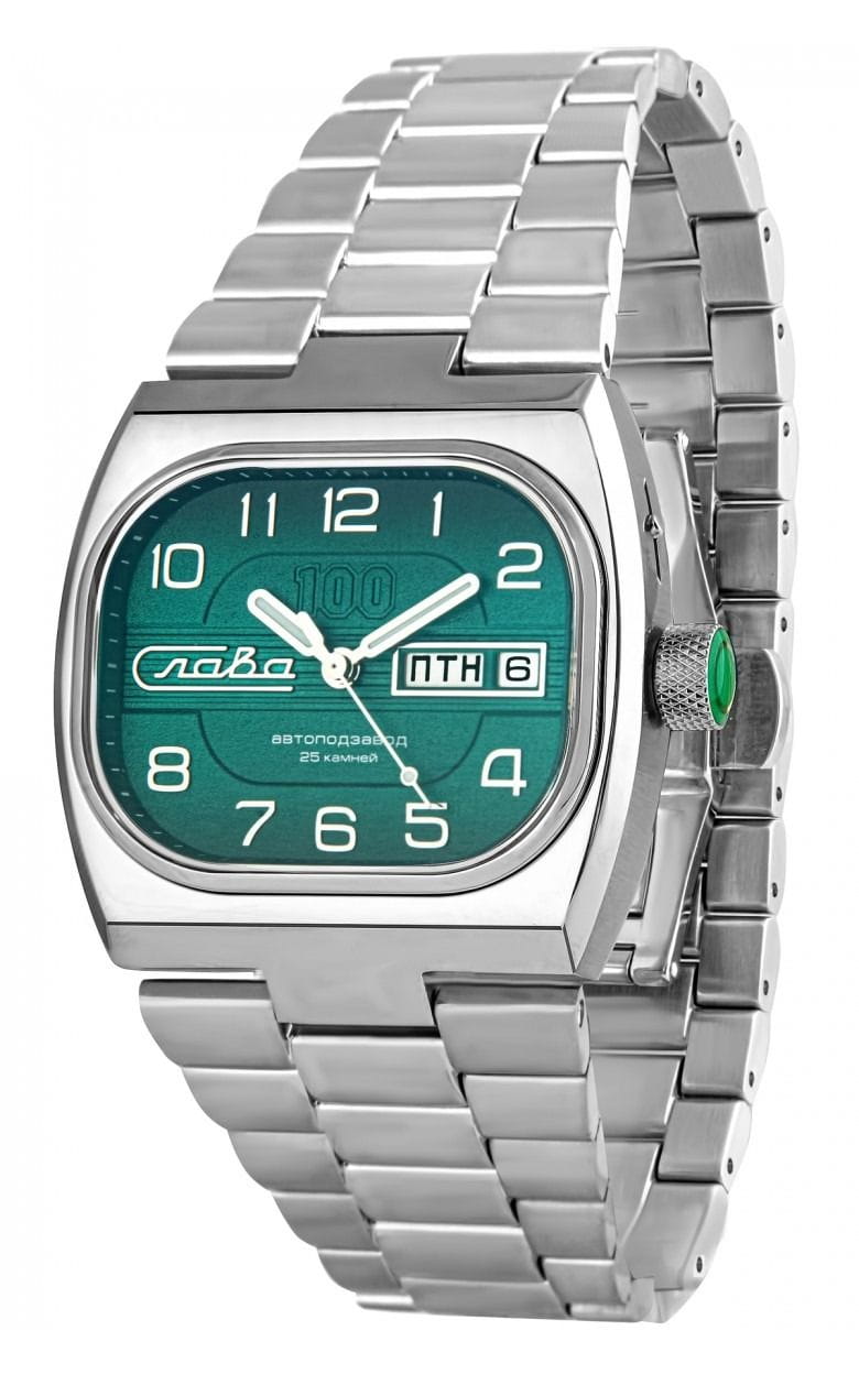 Российские часы Слава Телевизор 9040562/100-2427 оснащены механизмом Слава 2427, что обеспечивает исключительную надежность и точность хода. Корпус и браслет часов выполнены из стали, что придает им долговечность и устойчивость к внешним воздействиям. Сапфировое стеклоСапфировое стеклоПрочный и надёжный материал из кристалла сапфира синтетического происхождения, характеризующийся особой твёрдостью и устойчивостью к царапинам и повреждениям., которое еще и граненое, защищает зеленый циферблат от царапин. Водозащита уровня 100WR позволяет использовать часы в различных условиях. Эти часы идеально подойдут для повседневного использования, сочетая в себе стиль, надежность и функциональность. Стрелки с люминесцентным покрытиемЛюминесцентное покрытиеПозволяет считывать показания времени в темноте. Производители наносят на стрелки, часовые индексы, безель или поверхность циферблата светонакопительный состав, дающий холодное свечение., что облегчает чтение времени даже в условиях слабого освещения. Окошки дня недели и даты находятся в положении 3 часа. Стальной браслет на застежке «бабочка»Застёжка "бабочка"Такой вид застёжки дополняется предохранителями, помогающими избежать случайного раскрытия браслета. Обладают изящным исполнением. обеспечивает комфортное и надёжное крепление на запястье. Лимитированная серия ограничена 500 экземплярами, что подчеркивает их уникальность. Эти часы станут надежным спутником в вашей повседневной жизни.
