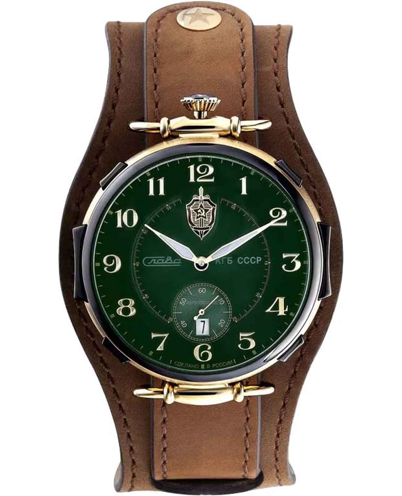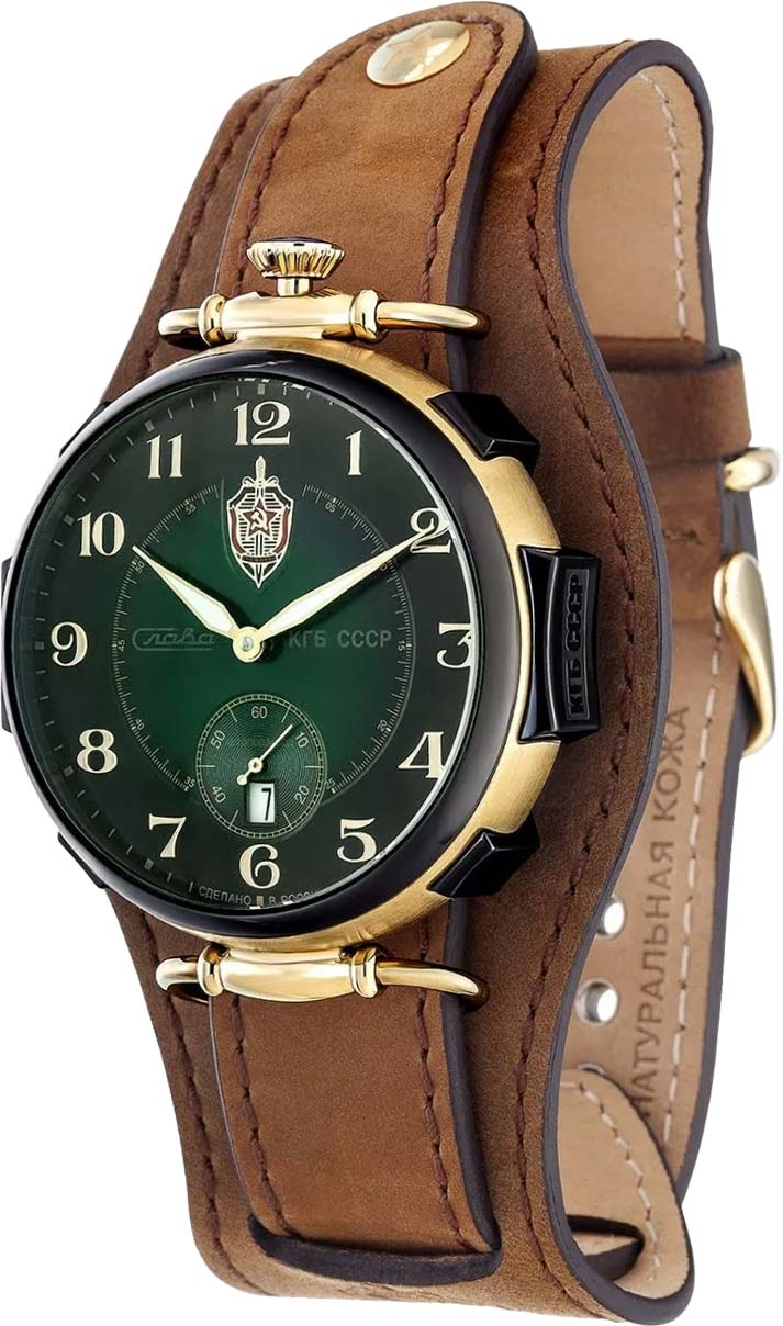 Модель 9624429/300-2555 от «Слава» — коллекционные механические часы с автоподзаводом, вдохновлённые эстетикой КГБ СССР. Корпус из нержавеющей стали с золотистым покрытием IP-покрытиемIP-покрытиеМетод ионного напыления. Демонстрирует повышенную устойчивость к истиранию, окислению и химическим веществам. Под воздействием высокого давления и температуры около 1500°C молекулы металла надёжно соединяются с частицами корпуса часов. и зелёный циферблат подчёркивают винтажный характер модели. Механизм SeaGull 2555 обеспечивает 42 часа запаса хода. Циферблат защищён минеральным стекломМинеральное стеклоМинеральное стекло представляет собой искусственно выращенный минерал кварца. Такое стекло отличается особой устойчивостью к повреждениям и царапинам. Уступает по некоторым качествам сапфировому стеклу., а натуральный кожаный ремешок на стандартной застежке обеспечивает комфортную посадку.