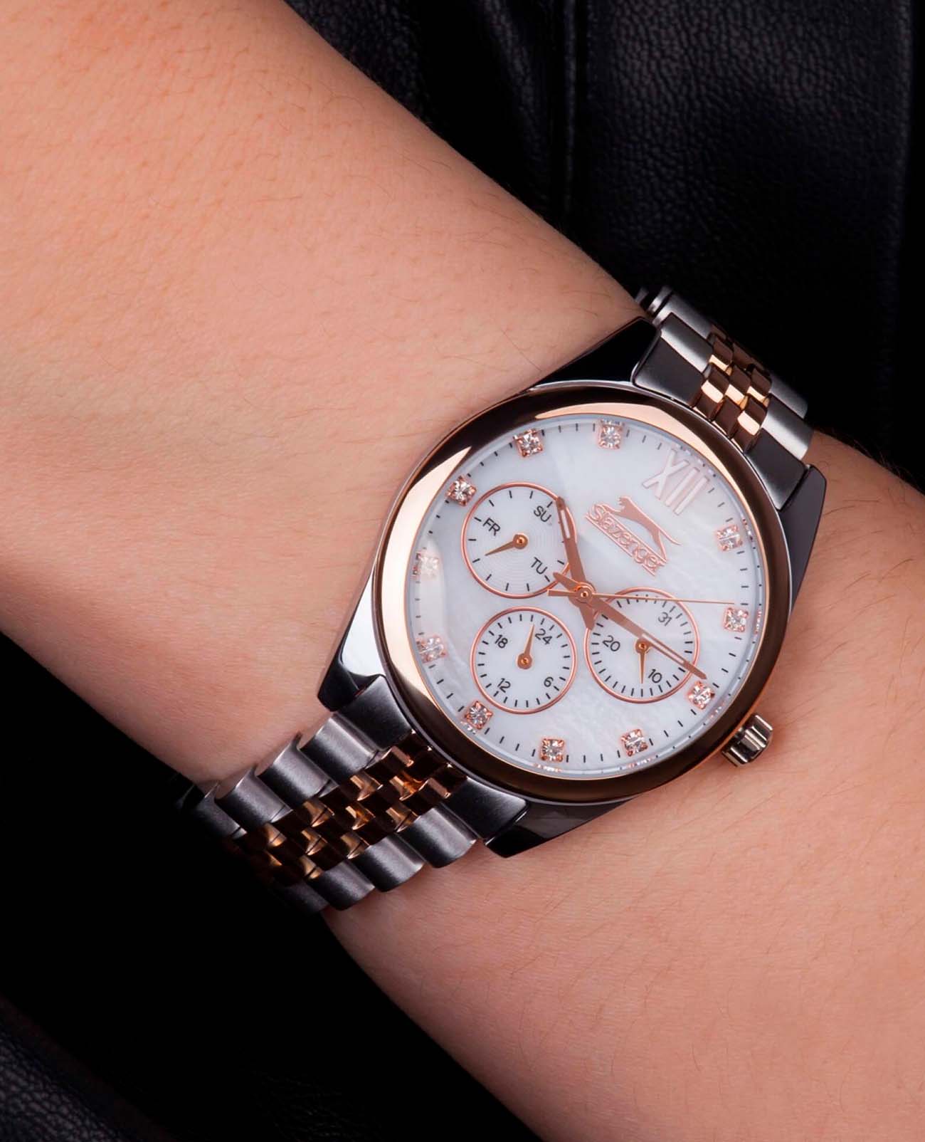 Женские наручные часы Slazenger SL.09.1990.4.01 сочетают в себе элегантный дизайн и практичность современных технологий. Модель обладает круглым корпусом диаметром 34 мм, изготовленным из суперметалла, что обеспечивает высокую устойчивость к внешним воздействиям. БезельБезельВнешний ободок, закрепляющий стекло. В спортивных часах так называется поворотное кольцо с делениями на циферблате, выполняет роль таймера – замеряет отрезки времени на шкале. Неподвижный безель – элемент декора. Однонаправленно вращающийся безель на дайверских часах позволяет фиксировать моменты погружения и выныривания на поверхность. с IP-покрытиемIP-покрытиеМетод ионного напыления. Демонстрирует повышенную устойчивость к истиранию, окислению и химическим веществам. Под воздействием высокого давления и температуры около 1500°C молекулы металла надёжно соединяются с частицами корпуса часов. Браслет выполнен из того же материала на раскладной застёжкеРаскладная застёжкаТакой тип застёжки используется только на браслетах из металла. Она никогда не раскрывается полностью, происходит разделение на 2 и более частей. Раскладывающая застёжка снизит вероятность потери часов к минимуму., гарантирующей комфортное ношение. Белый циферблат оснащен индексами для лучшей читаемости времени и дополнен функцией календаря. Для защиты применяется минеральное стеклоМинеральное стеклоМинеральное стекло представляет собой искусственно выращенный минерал кварца. Такое стекло отличается особой устойчивостью к повреждениям и царапинам. Уступает по некоторым качествам сапфировому стеклу., обеспечивающее прочную защиту от царапин. Часы работают на японском кварцевом механизме, что гарантирует точное время без необходимости подзаводки. Водонепроницаемость составляет 3 атмосферы (30 метров), что позволяет использовать их в повседневной жизни, но не рекомендуется для плавания или занятий водными видами спорта.