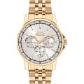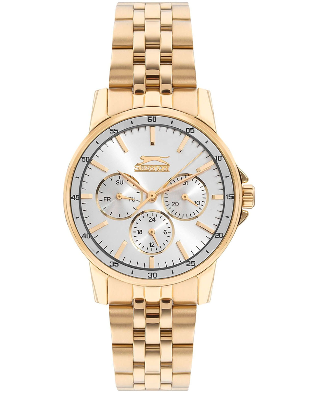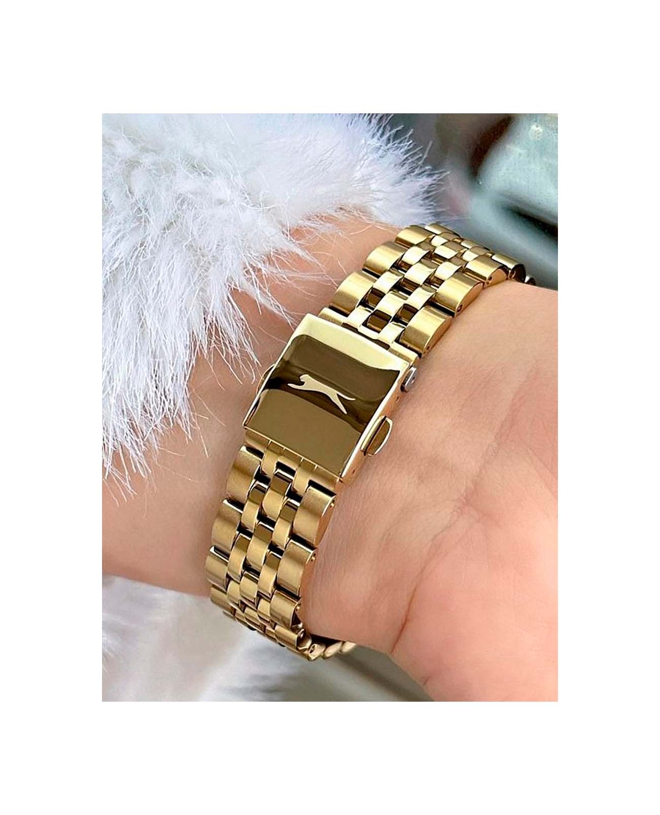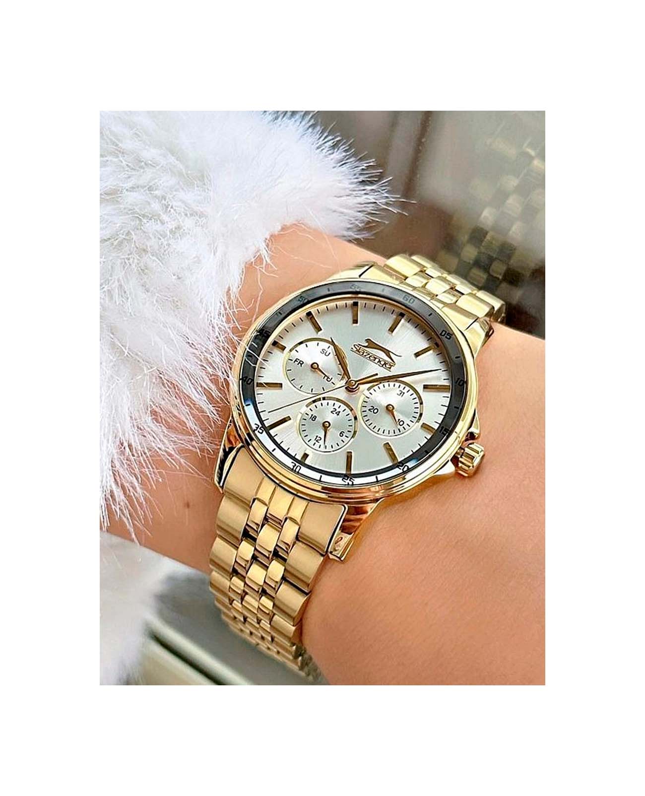 Женские наручные часы Slazenger SL.09.2009.4.06 сочетают в себе элегантный дизайн и практичность современных технологий. Модель обладает круглым корпусом диаметром 36 мм, изготовленным из суперметалла с IP-покрытиемIP-покрытиеМетод ионного напыления. Демонстрирует повышенную устойчивость к истиранию, окислению и химическим веществам. Под воздействием высокого давления и температуры около 1500°C молекулы металла надёжно соединяются с частицами корпуса часов., что обеспечивает высокую устойчивость к внешним воздействиям. Браслет выполнен из того же материала с раскладной застежкойРаскладная застёжкаТакой тип застёжки используется только на браслетах из металла. Она никогда не раскрывается полностью, происходит разделение на 2 и более частей. Раскладывающая застёжка снизит вероятность потери часов к минимуму., гарантирующей комфортное ношение. Серебристый циферблат оснащен индексами для лучшей читаемости времени и дополнен функцией отображения даты, а также дня недели на малых циферблатах. Для защиты применяется минеральное стеклоМинеральное стеклоМинеральное стекло представляет собой искусственно выращенный минерал кварца. Такое стекло отличается особой устойчивостью к повреждениям и царапинам. Уступает по некоторым качествам сапфировому стеклу., обеспечивающее прочную защиту от царапин. Часы работают на японском кварцевом механизме, который питается от батарейки и гарантирует точное время без необходимости подзаводки. Водонепроницаемость составляет 3 атмосферы (30 метров), что позволяет использовать их в повседневной жизни, но не рекомендуется для плавания или занятий водными видами спорта.