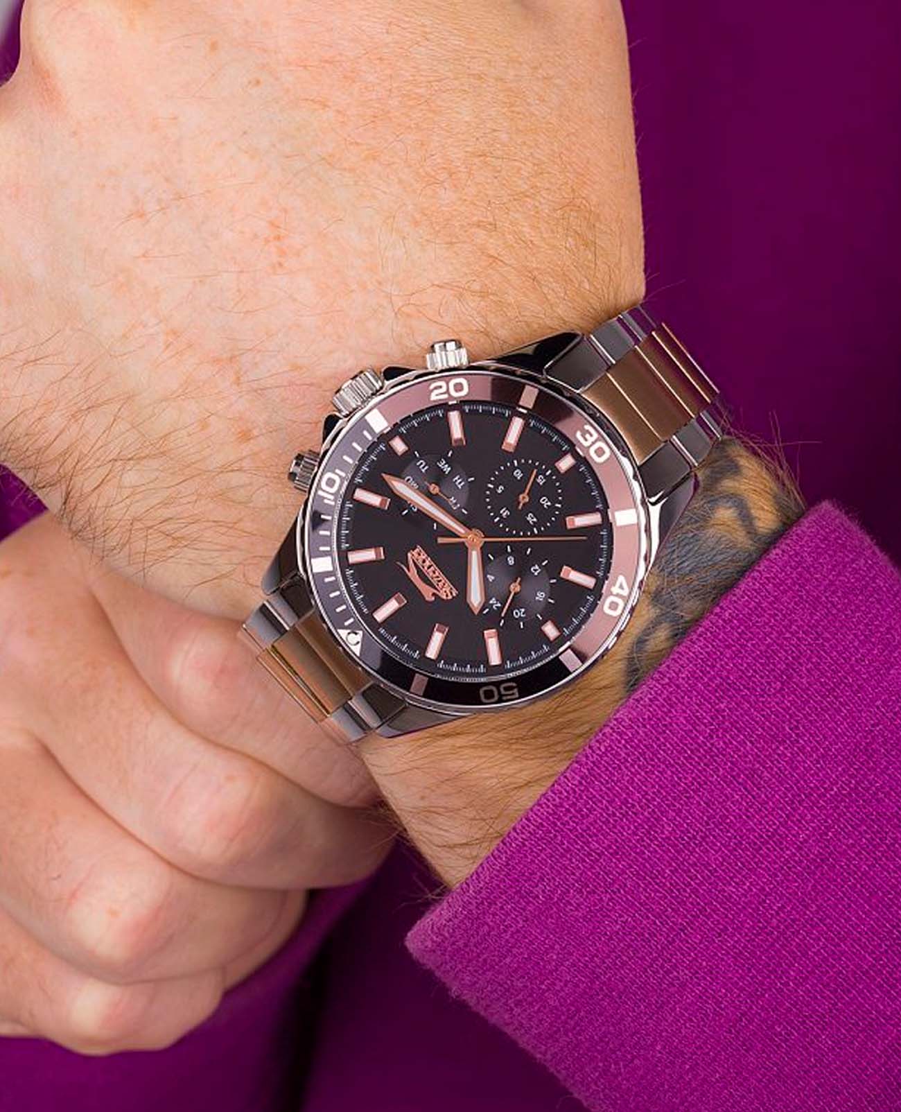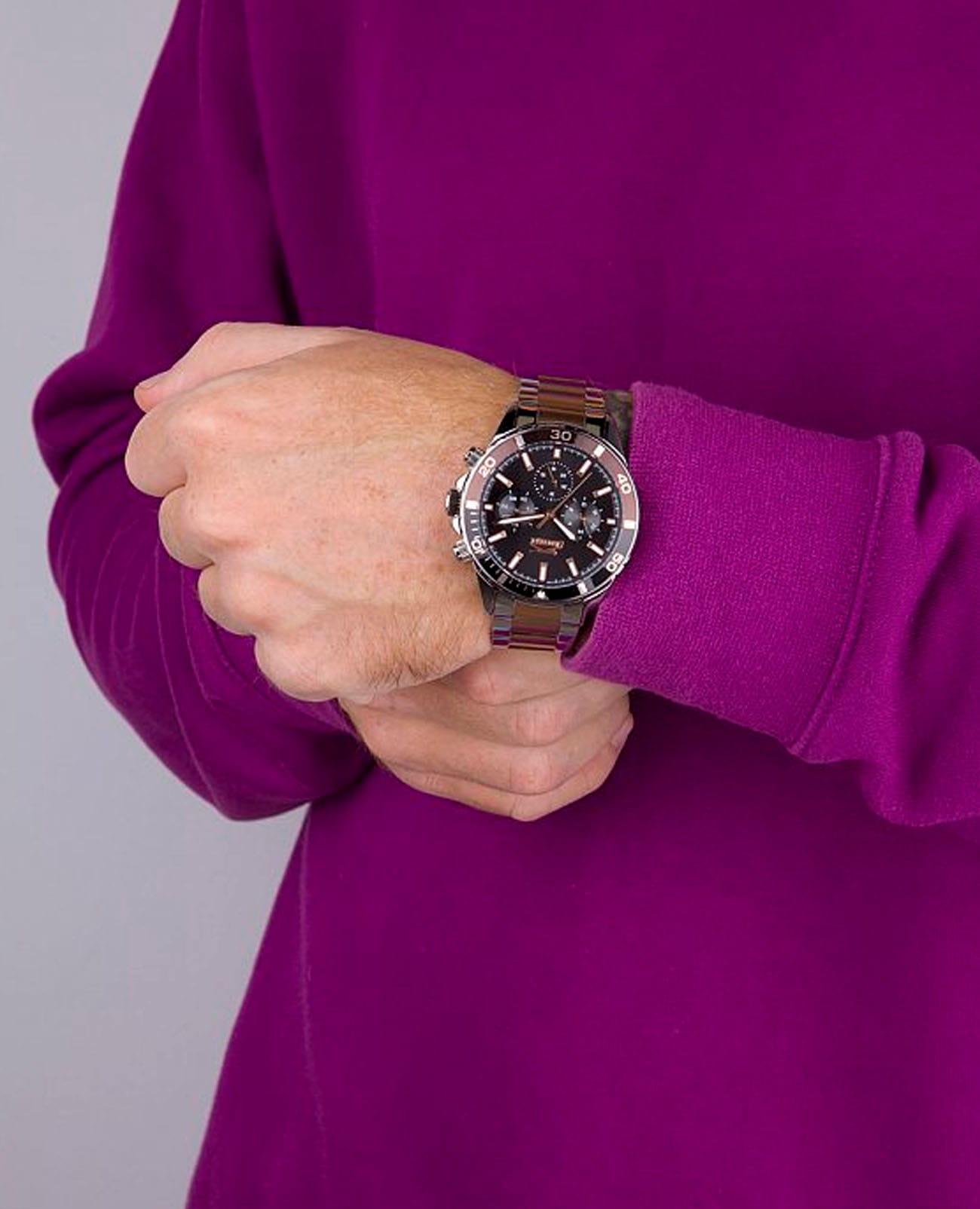 Мужские наручные часы Slazenger SL.09.2065.2.04 из коллекции современных аксессуаров сочетают в себе элегантный дизайн и функциональность. Модель обладает круглым корпусом диаметром 46 мм, изготовленным из суперметалла с серебристым покрытием, что обеспечивает высокую устойчивость к внешним воздействиям. БезельБезельВнешний ободок, закрепляющий стекло. В спортивных часах так называется поворотное кольцо с делениями на циферблате, выполняет роль таймера – замеряет отрезки времени на шкале. Неподвижный безель – элемент декора. Однонаправленно вращающийся безель на дайверских часах позволяет фиксировать моменты погружения и выныривания на поверхность. с IP-покрытиемIP-покрытиеМетод ионного напыления. Демонстрирует повышенную устойчивость к истиранию, окислению и химическим веществам. Под воздействием высокого давления и температуры около 1500°C молекулы металла надёжно соединяются с частицами корпуса часов.. Черный циферблат украшен логотипом бренда и метками времени, а для лучшей видимости в темноте стрелки и метки имеют люминесцентное покрытиеЛюминесцентное покрытиеПозволяет считывать показания времени в темноте. Производители наносят на стрелки, часовые индексы, безель или поверхность циферблата светонакопительный состав, дающий холодное свечение.. Для защиты используется минеральное стеклоМинеральное стеклоМинеральное стекло представляет собой искусственно выращенный минерал кварца. Такое стекло отличается особой устойчивостью к повреждениям и царапинам. Уступает по некоторым качествам сапфировому стеклу., обеспечивающее прочную защиту от царапин. Часы работают на японском кварцевом механизме, что гарантирует точное время без необходимости подзаводки. Браслет выполнен из суперметалла с частичным IP-покрытиемIP-покрытиеМетод ионного напыления. Демонстрирует повышенную устойчивость к истиранию, окислению и химическим веществам. Под воздействием высокого давления и температуры около 1500°C молекулы металла надёжно соединяются с частицами корпуса часов., гарантирующей комфортное ношение и стильный внешний вид. Водонепроницаемость часов составляет 5 атмосфер (WR50), что позволяет использовать их при легком контакте с водой, например, во время мытья рук, но не рекомендуется для плавания или дайвинга.