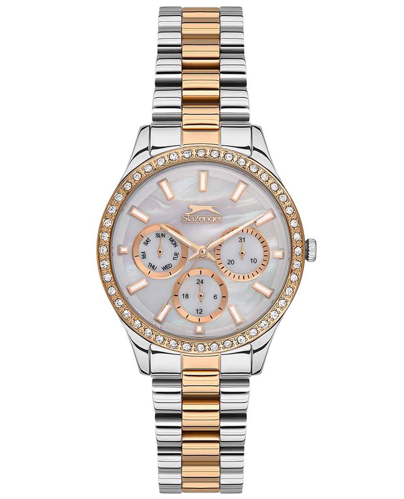 Женские наручные часы Slazenger SL.09.2069.4.02 сочетают в себе классический дизайн и высокое качество исполнения. Модель обладает круглым корпусом диаметром 34 мм, изготовленным из суперметалла, что обеспечивает устойчивость к внешним воздействиям. Браслет выполнен из суперметалла с частичным IP-покрытиемIP-покрытиеМетод ионного напыления. Демонстрирует повышенную устойчивость к истиранию, окислению и химическим веществам. Под воздействием высокого давления и температуры около 1500°C молекулы металла надёжно соединяются с частицами корпуса часов. на раскладной застёжкеРаскладная застёжкаТакой тип застёжки используется только на браслетах из металла. Она никогда не раскрывается полностью, происходит разделение на 2 и более частей. Раскладывающая застёжка снизит вероятность потери часов к минимуму.. Неподвижный безельБезельВнешний ободок, закрепляющий стекло. В спортивных часах так называется поворотное кольцо с делениями на циферблате, выполняет роль таймера – замеряет отрезки времени на шкале. Неподвижный безель – элемент декора. Однонаправленно вращающийся безель на дайверских часах позволяет фиксировать моменты погружения и выныривания на поверхность. из суперметалла с IP-покрытиемIP-покрытиеМетод ионного напыления. Демонстрирует повышенную устойчивость к истиранию, окислению и химическим веществам. Под воздействием высокого давления и температуры около 1500°C молекулы металла надёжно соединяются с частицами корпуса часов. украшен кристаллами. Перламутровый циферблат оформлен логотипом бренда и метками времени. Имеются дополнительные малые циферблаты для отображения даты, дня недели и текущего времени в 24-часовом формате. Для защиты используется минеральное стеклоМинеральное стеклоМинеральное стекло представляет собой искусственно выращенный минерал кварца. Такое стекло отличается особой устойчивостью к повреждениям и царапинам. Уступает по некоторым качествам сапфировому стеклу., обеспечивающее прочную защиту от царапин. Стрелки и метки имеют люминесцентное покрытиеЛюминесцентное покрытиеПозволяет считывать показания времени в темноте. Производители наносят на стрелки, часовые индексы, безель или поверхность циферблата светонакопительный состав, дающий холодное свечение., что позволяет легко читать время в темноте. Часы работают на японском кварцевом механизме, который обеспечивает точность хода без необходимости подзаводки. Водонепроницаемость часов составляет 3 атмосферы (WR30), что позволяет защитить корпус от случайных брызг или капель дождя.