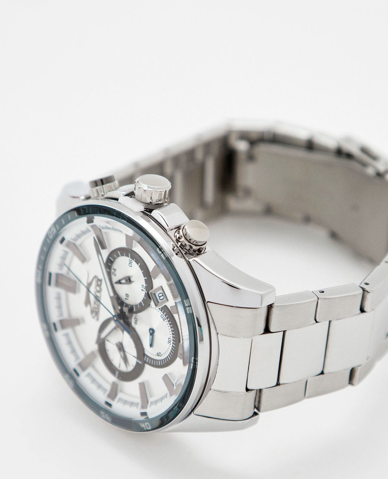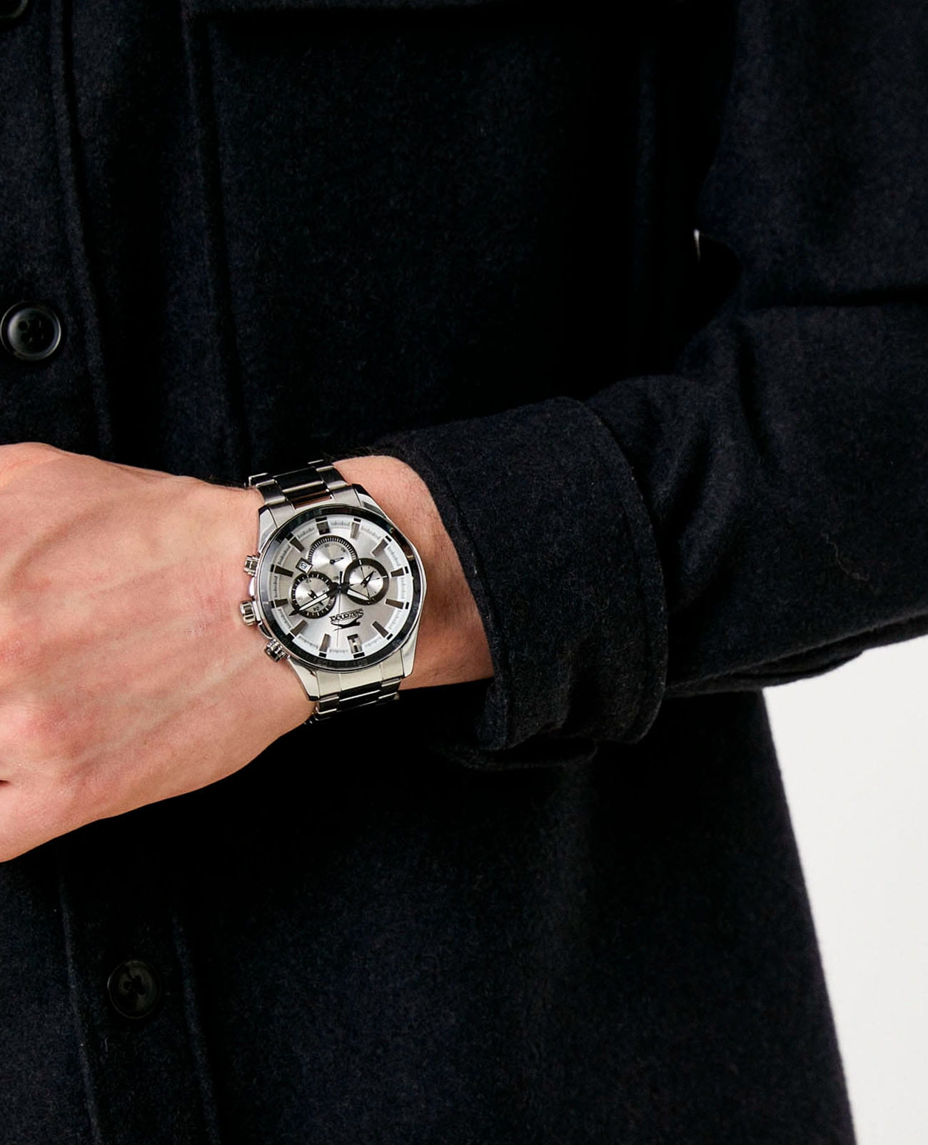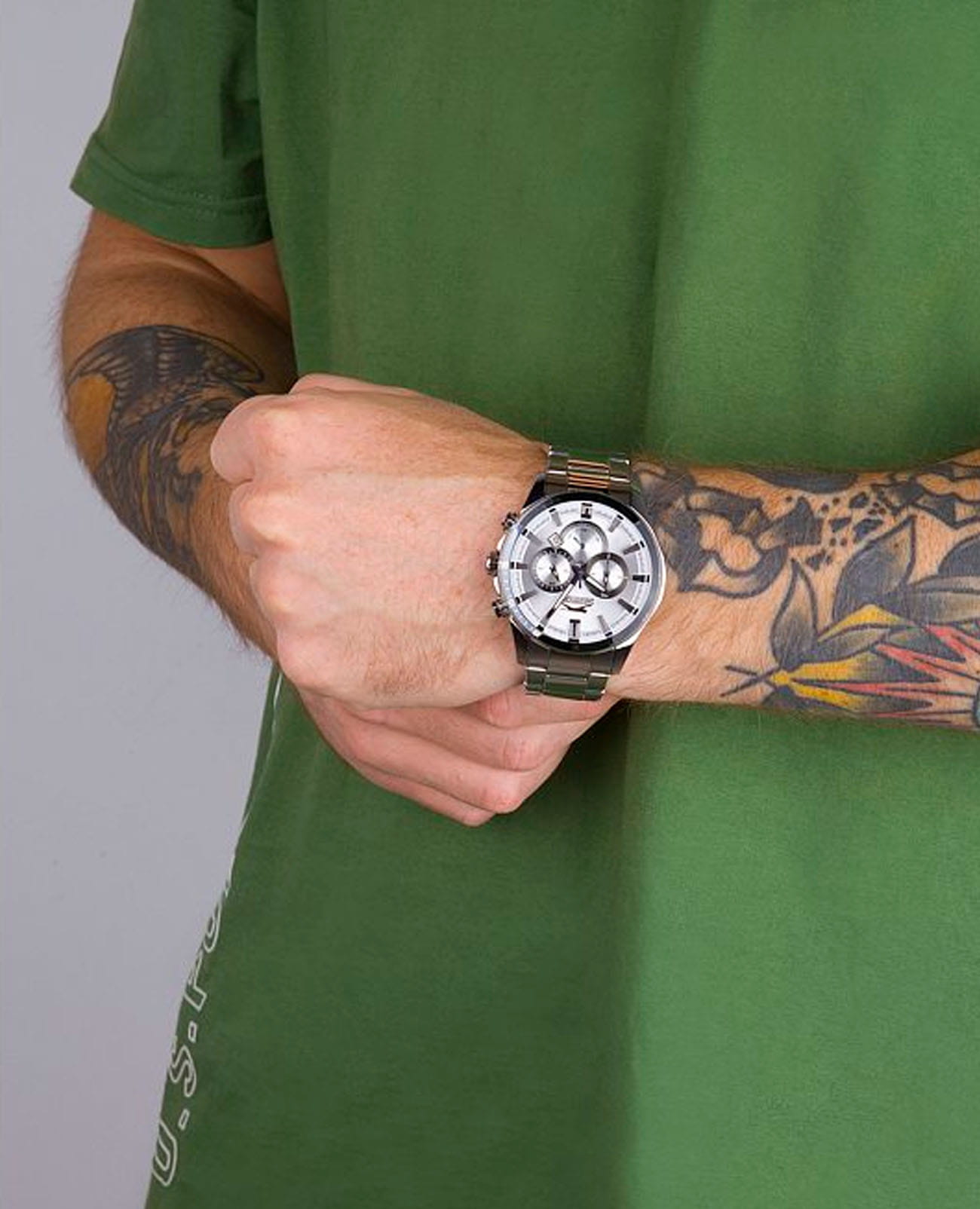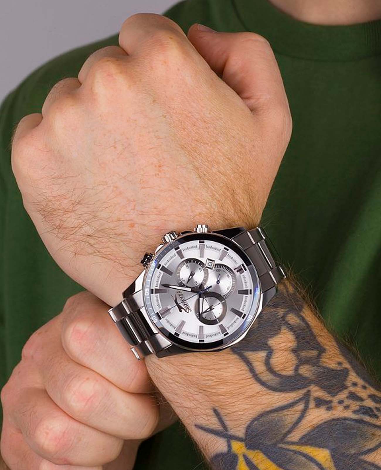 Мужские наручные часы-хронографХронографФункция позволяет измерять отрезки времени с особой точностью: часы, минуты, секунды. Верным признаком хронографа является наличие на циферблате 3 дополнительных окошек-счётчиков. Slazenger SL.09.2078.2.02 из коллекции современных аксессуаров сочетают в себе классический дизайн и функциональность. Модель обладает круглым корпусом, изготовленным из суперметалла, что обеспечивает высокую устойчивость к внешним воздействиям. Браслет выполнен из суперметалла с раскладной застежкойРаскладной замокДанный вариант застежки используется только на часах с металлическим браслетом. Отличительная особенность такого крепления в том, что длина браслета становится универсальной и вы можете самостоятельно отрегулировать нужный вам размер – застежка просто двигается по браслету часов., гарантирующей комфортное ношение и безопасность. Циферблат оснащен указателем текущего времени и системой для измерения коротких промежутков времени, делая модель подходящей для тех, кто ведет активный образ жизни. Для защиты используется минеральное стеклоМинеральное стеклоМинеральное стекло представляет собой искусственно выращенный минерал кварца. Такое стекло отличается особой устойчивостью к повреждениям и царапинам. Уступает по некоторым качествам сапфировому стеклу., обеспечивающее прочную защиту от царапин. БезельБезельВнешний ободок, закрепляющий стекло. В спортивных часах так называется поворотное кольцо с делениями на циферблате, выполняет роль таймера – замеряет отрезки времени на шкале. Неподвижный безель – элемент декора. Однонаправленно вращающийся безель на дайверских часах позволяет фиксировать моменты погружения и выныривания на поверхность. с IP-покрытиемIP-покрытиеМетод ионного напыления. Демонстрирует повышенную устойчивость к истиранию, окислению и химическим веществам. Под воздействием высокого давления и температуры около 1500°C молекулы металла надёжно соединяются с частицами корпуса часов.. Часы работают на кварцевом механизме, что гарантирует точное время без необходимости подзаводки. Стрелки с люминесцентным покрытиемЛюминесцентное покрытиеПозволяет считывать показания времени в темноте. Производители наносят на стрелки, часовые индексы, безель или поверхность циферблата светонакопительный состав, дающий холодное свечение.. Водонепроницаемость часов достигает 50 метров (5 атмосфер), что позволяет использовать их при легком контакте с водой, например, во время мытья рук, но не рекомендуется для плавания или дайвинга. Часы также имеют 24-часовой указатель времени и рассчитаны на использование мужчинами.
