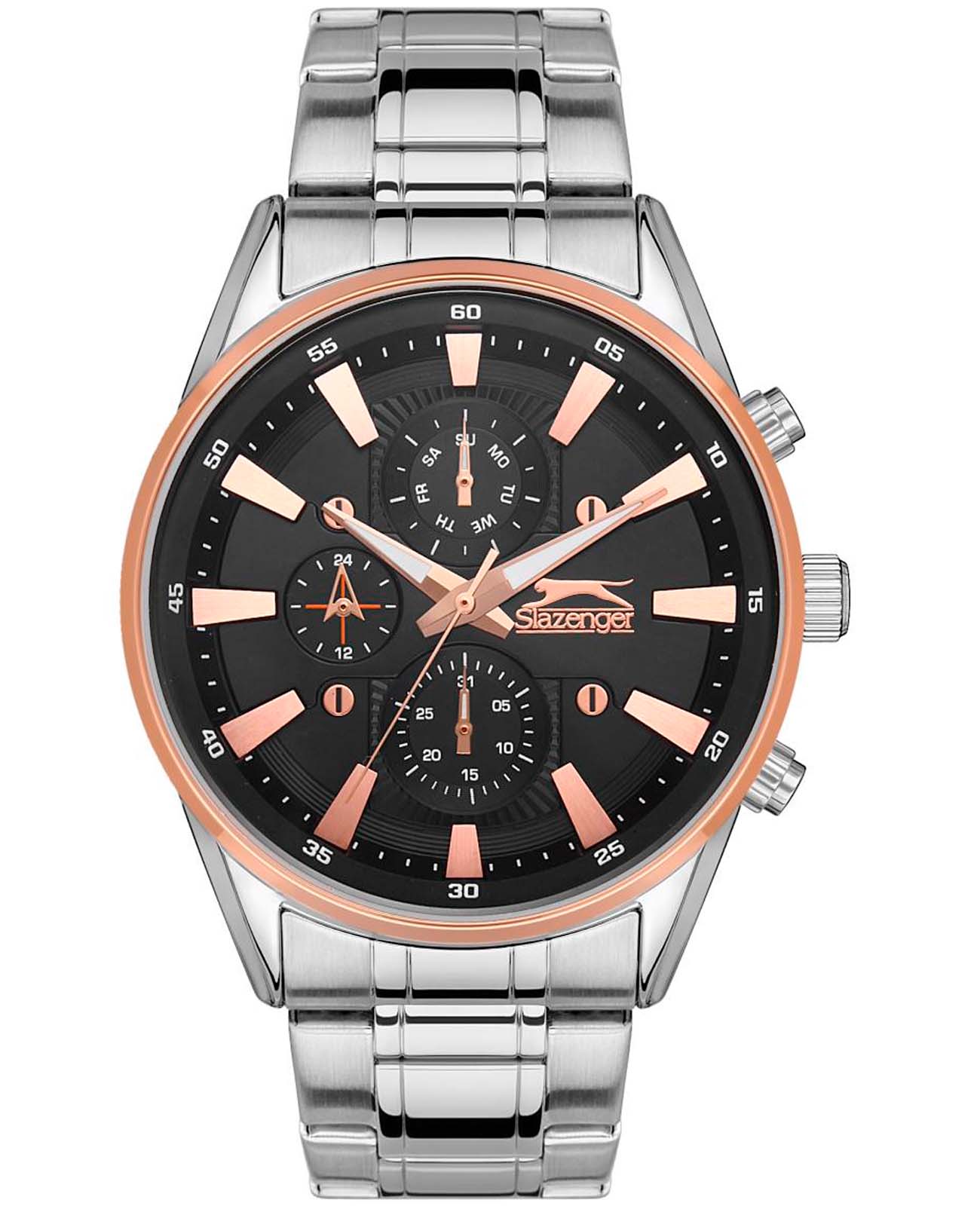 Мужские наручные часы Slazenger SL.09.2118.2.03 сочетают в себе классический дизайн и надежность современных технологий. Модель обладает круглым корпусом диаметром 46 мм, изготовленным из суперметалла, что обеспечивает высокую устойчивость к внешним воздействиям. БезельБезельВнешний ободок, закрепляющий стекло. В спортивных часах так называется поворотное кольцо с делениями на циферблате, выполняет роль таймера – замеряет отрезки времени на шкале. Неподвижный безель – элемент декора. Однонаправленно вращающийся безель на дайверских часах позволяет фиксировать моменты погружения и выныривания на поверхность. с IP-покрытиемIP-покрытиеМетод ионного напыления. Демонстрирует повышенную устойчивость к истиранию, окислению и химическим веществам. Под воздействием высокого давления и температуры около 1500°C молекулы металла надёжно соединяются с частицами корпуса часов.. Браслет выполнен из стали с раскладной застежкойРаскладной замокДанный вариант застежки используется только на часах с металлическим браслетом. Отличительная особенность такого крепления в том, что длина браслета становится универсальной и вы можете самостоятельно отрегулировать нужный вам размер – застежка просто двигается по браслету часов., гарантирующей комфортное ношение и безопасность. Циферблат черного цвета декорирован стрелками, которые обеспечивают читаемость времени даже в условиях недостаточной освещенности. Для защиты используется минеральное стеклоМинеральное стеклоМинеральное стекло представляет собой искусственно выращенный минерал кварца. Такое стекло отличается особой устойчивостью к повреждениям и царапинам. Уступает по некоторым качествам сапфировому стеклу., обеспечивающее прочную защиту от царапин. Часы работают на кварцевом механизме, что гарантирует точное время без необходимости подзаводки. Модель также оснащена дополнительными функциями: отображением даты, дня недели и текущего времени в 24-часовом формате на малых циферблатах, делая ее практичной для повседневного использования. Водонепроницаемость часов достигает 5 атмосфер (WR50), что позволяет использовать их во время плавания, однако не рекомендуется для дайвинга или других водных видов спорта. Толщина часов составляет 12 мм.