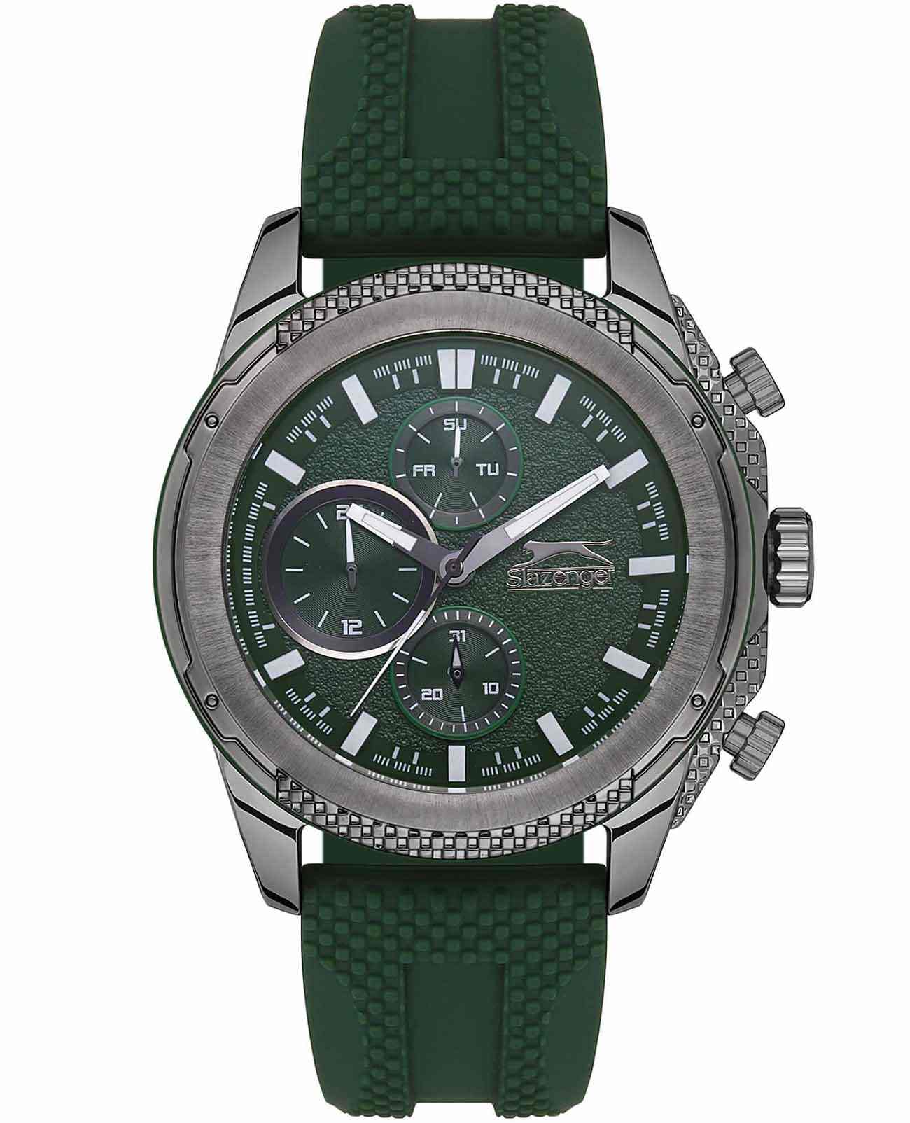 Часы Slazenger SL.09.2153.2.04 представляют собой стильный и функциональный аксессуар для мужчин. Эти кварцевые часы идеально подходят для тех, кто ценит как точность, так и современный дизайн. Корпус и безельБезельВнешний ободок, закрепляющий стекло. В спортивных часах так называется поворотное кольцо с делениями на циферблате, выполняет роль таймера – замеряет отрезки времени на шкале. Неподвижный безель – элемент декора. Однонаправленно вращающийся безель на дайверских часах позволяет фиксировать моменты погружения и выныривания на поверхность. из суперметалла с серым IP-покрытиемIP-покрытиеМетод ионного напыления. Демонстрирует повышенную устойчивость к истиранию, окислению и химическим веществам. Под воздействием высокого давления и температуры около 1500°C молекулы металла надёжно соединяются с частицами корпуса часов. придаёт модели прочность и долговечность, а зеленый силиконовый ремешок обеспечивает комфортное ношение и отлично сочетается с общим дизайном часов. Диаметр корпуса составляет 46 мм, а толщина — 12 мм, что делает часы выразительными и заметными на запястье. Минеральное стеклоМинеральное стеклоМинеральное стекло представляет собой искусственно выращенный минерал кварца. Такое стекло отличается особой устойчивостью к повреждениям и царапинам. Уступает по некоторым качествам сапфировому стеклу. защищает циферблат от царапин и повреждений, сохраняя его внешний вид. Часы обладают водозащитой уровня WR 50, что позволяет им выдерживать воздействие воды в повседневных ситуациях. Одной из ключевых особенностей является наличие дополнительных малых циферблатов, которые отображают дату, день недели и текущее время в 24-часовом формате. Все эти функции обеспечивают удобное пользование и позволяют всегда оставаться в курсе времени. Люминесцентное покрытиеЛюминесцентное покрытиеПозволяет считывать показания времени в темноте. Производители наносят на стрелки, часовые индексы, безель или поверхность циферблата светонакопительный состав, дающий холодное свечение. на стрелках обеспечивает отличную видимость в темноте. Силиконовый ремешок оснащен классической застежкой, что обеспечивает надежную фиксацию на руке. Вес часов составляет 104 грамма, что делает их достаточно легкими для повседневного использования.