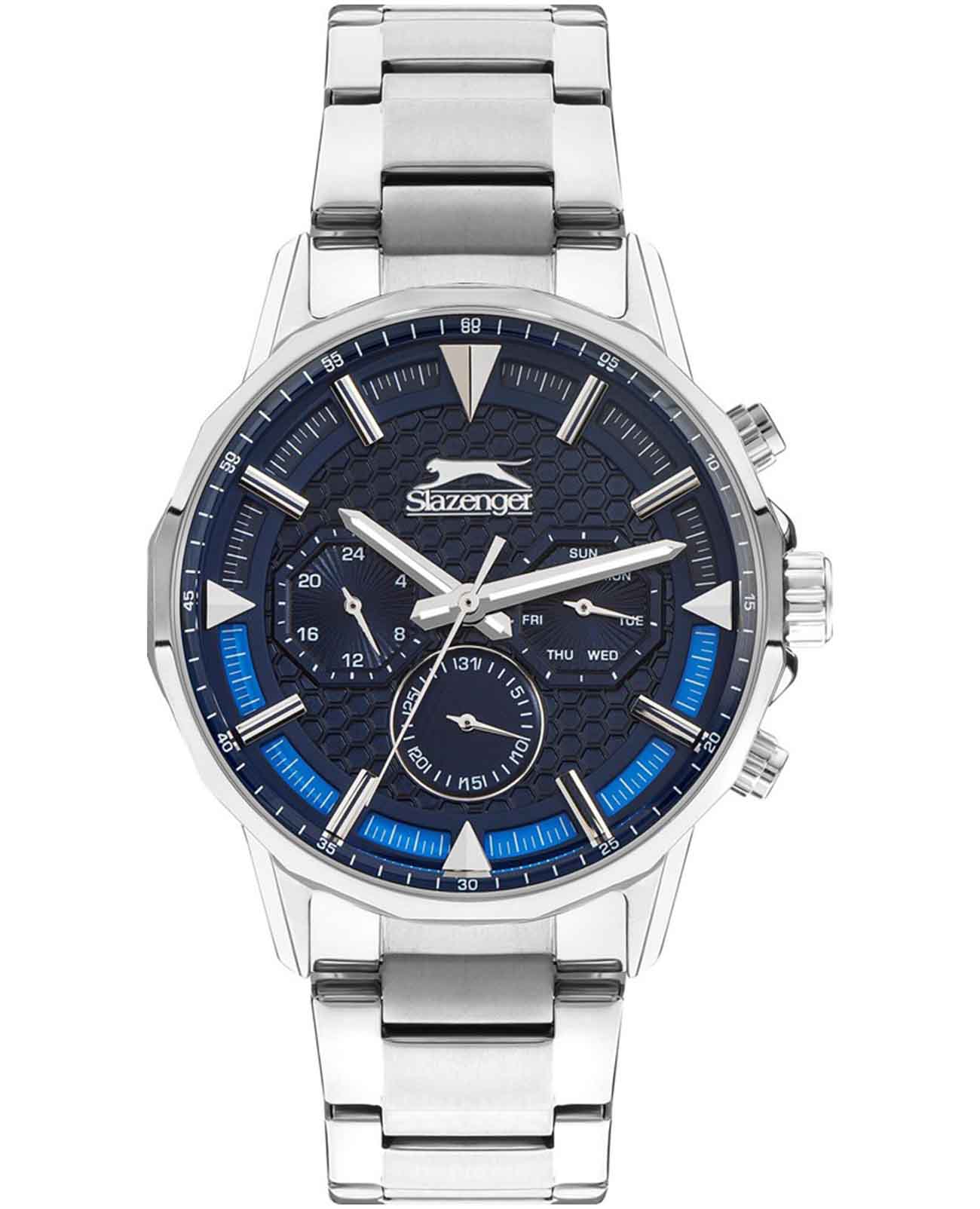 Стильные мужские наручные часы Slazenger SL.09.2216.2.04 станут идеальным аксессуаром для современного мужчины. Этот британский бренд славится своим качеством и надежностью, а данная модель не является исключением. Часы оснащены кварцевым механизмом, что обеспечивает точность хода и долговечность использования. Корпус часов выполнен из металла, а прочное  минеральное стеклоМинеральное стеклоМинеральное стекло представляет собой искусственно выращенный минерал кварца. Такое стекло отличается особой устойчивостью к повреждениям и царапинам. Уступает по некоторым качествам сапфировому стеклу. защищает циферблат от царапин и повреждений. Элегантный металлический браслет серебристого цвета снабжен удобной раскладной застёжкойРаскладная застёжкаТакой тип застёжки используется только на браслетах из металла. Она никогда не раскрывается полностью, происходит разделение на 2 и более частей. Раскладывающая застёжка снизит вероятность потери часов к минимуму., что гарантирует комфортное ношение на запястье. Ширина браслета составляет 22 мм, что придает часам солидный вид. Диаметр корпуса равен 45 мм, а толщина 12 мм, что делает эту модель заметной, но в то же время не громоздкой. Водозащита уровня WR 50 позволяет использовать часы в повседневной жизни, не беспокоясь о случайных попаданиях воды. Стрелки снабжены люминесцентным покрытиемЛюминесцентное покрытиеПозволяет считывать показания времени в темноте. Производители наносят на стрелки, часовые индексы, безель или поверхность циферблата светонакопительный состав, дающий холодное свечение., что позволяет легко считывать время в темноте. Функциональные возможности часов включают отображение даты, дня недели и времени в 24-часовом формате на дополнительных малых циферблатах. Это делает модель не только стильной, но и практичной в использовании.