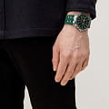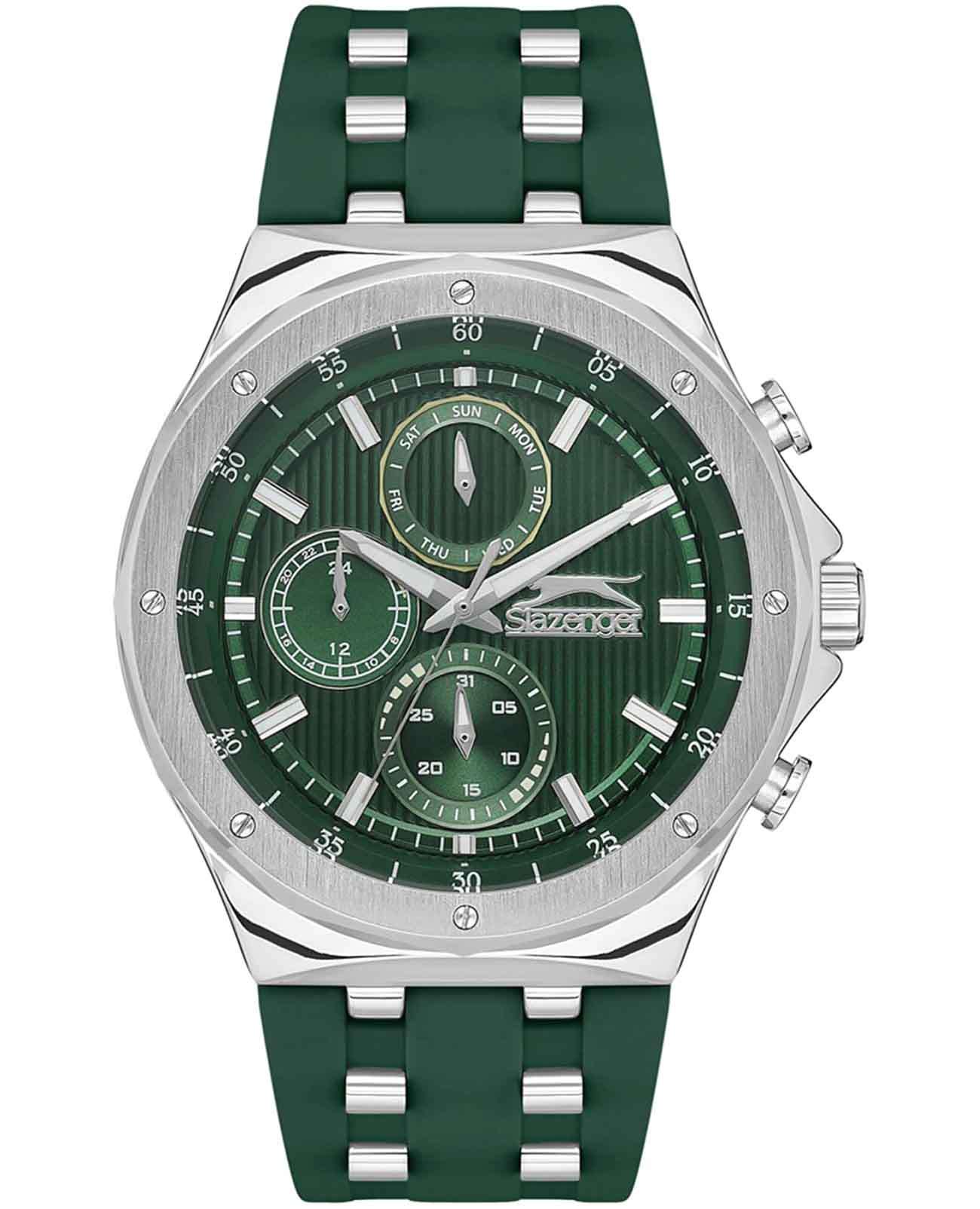Мужские наручные часы Slazenger SL.09.2218.2.02 — идеальный аксессуар для тех, кто ценит стиль и функциональность. Эти часы, созданные известным британским брендом, отличаются высоким качеством и надежностью. Оснащенные кварцевым механизмом, они гарантируют точность хода и долгий срок службы. Корпус часов выполнен из прочного металла, а зеленый циферблат защищен минеральным стекломМинеральное стеклоМинеральное стекло представляет собой искусственно выращенный минерал кварца. Такое стекло отличается особой устойчивостью к повреждениям и царапинам. Уступает по некоторым качествам сапфировому стеклу., устойчивым к царапинам и повреждениям. Зеленый резиновый ремешок с металлическими вставками и классической застежкой обеспечивает комфортное ношение и надежную фиксацию на запястье. Диаметр корпуса составляет 46 мм, а толщина — 12 мм, что придает часам современный и стильный вид. Благодаря водозащите уровня WR 50, вы можете не беспокоиться о случайных попаданиях влаги, что делает эти часы идеальными для повседневного использования. Стрелки снабжены люминесцентным покрытиемЛюминесцентное покрытиеПозволяет считывать показания времени в темноте. Производители наносят на стрелки, часовые индексы, безель или поверхность циферблата светонакопительный состав, дающий холодное свечение., что позволяет легко считывать время в темноте. Функциональность модели включает в себя отображение даты, дня недели и времени в 24-часовом формате на дополнительных малых циферблатах, что делает часы не только стильными, но и практичными.