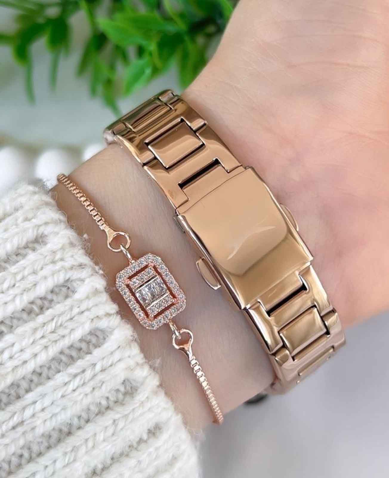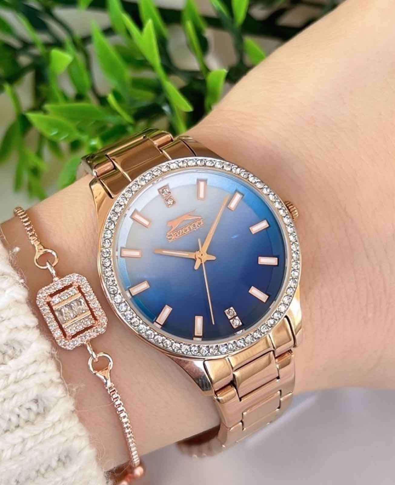 Элегантные наручные женские часы Slazenger SL.09.2222.3.04 созданы для тех, кто ценит стиль и изящество в каждом аксессуаре. Корпус диаметром 34 мм сделан из прочного металла с износостойким розово-золотистым IP-покрытиемIP-покрытиеМетод ионного напыления. Демонстрирует повышенную устойчивость к истиранию, окислению и химическим веществам. Под воздействием высокого давления и температуры около 1500°C молекулы металла надёжно соединяются с частицами корпуса часов., а безельБезельВнешний ободок, закрепляющий стекло. В спортивных часах так называется поворотное кольцо с делениями на циферблате, выполняет роль таймера – замеряет отрезки времени на шкале. Неподвижный безель – элемент декора. Однонаправленно вращающийся безель на дайверских часах позволяет фиксировать моменты погружения и выныривания на поверхность. усыпан фианитами, что придаёт аксессуару современный вид и долговечность. Циферблат украшен бело-синей градиентной отделкой и изящными фианитами, придающими модели особый блеск и шарм. Кварцевый механизм обеспечивает точность хода, а минеральное стеклоМинеральное стеклоМинеральное стекло представляет собой искусственно выращенный минерал кварца. Такое стекло отличается особой устойчивостью к повреждениям и царапинам. Уступает по некоторым качествам сапфировому стеклу. надежно защищает часы от случайных повреждений. Металлический браслет с розово-золотистым IP-покрытиемIP-покрытиеМетод ионного напыления. Демонстрирует повышенную устойчивость к истиранию, окислению и химическим веществам. Под воздействием высокого давления и температуры около 1500°C молекулы металла надёжно соединяются с частицами корпуса часов. снабжен удобной раскладной застёжкойРаскладная застёжкаТакой тип застёжки используется только на браслетах из металла. Она никогда не раскрывается полностью, происходит разделение на 2 и более частей. Раскладывающая застёжка снизит вероятность потери часов к минимуму., что гарантирует комфортное ношение на запястье. Стрелки и метки снабжены люминесцентным покрытиемЛюминесцентное покрытиеПозволяет считывать показания времени в темноте. Производители наносят на стрелки, часовые индексы, безель или поверхность циферблата светонакопительный состав, дающий холодное свечение., что позволяет легко считывать время в темноте. Водозащита 3 ATM позволяет не беспокоиться о случайных брызгах и попадании влаги. Толщина корпуса составляет всего 10 мм, благодаря чему часы изящно смотрятся на запястье и не доставляют дискомфорта при носке. Эта модель станет отличным выбором для повседневных образов и особых случаев, подчеркивая индивидуальность и безупречный вкус своей обладательницы.