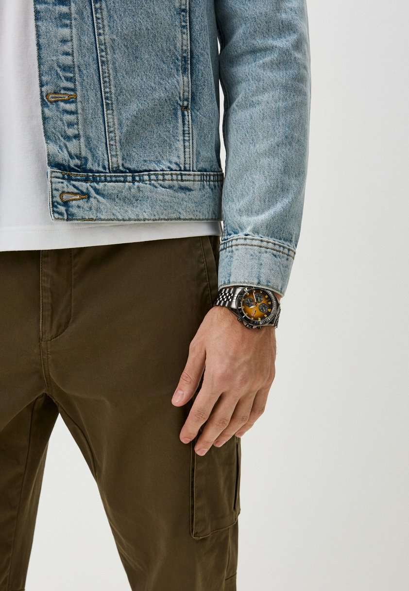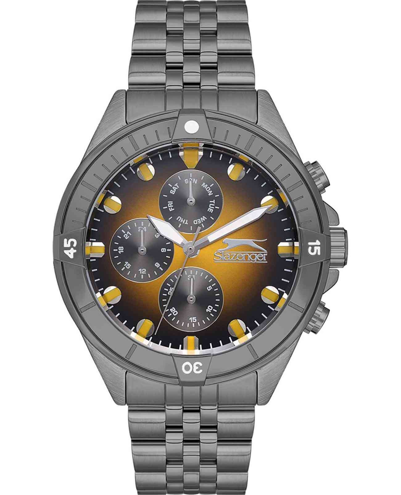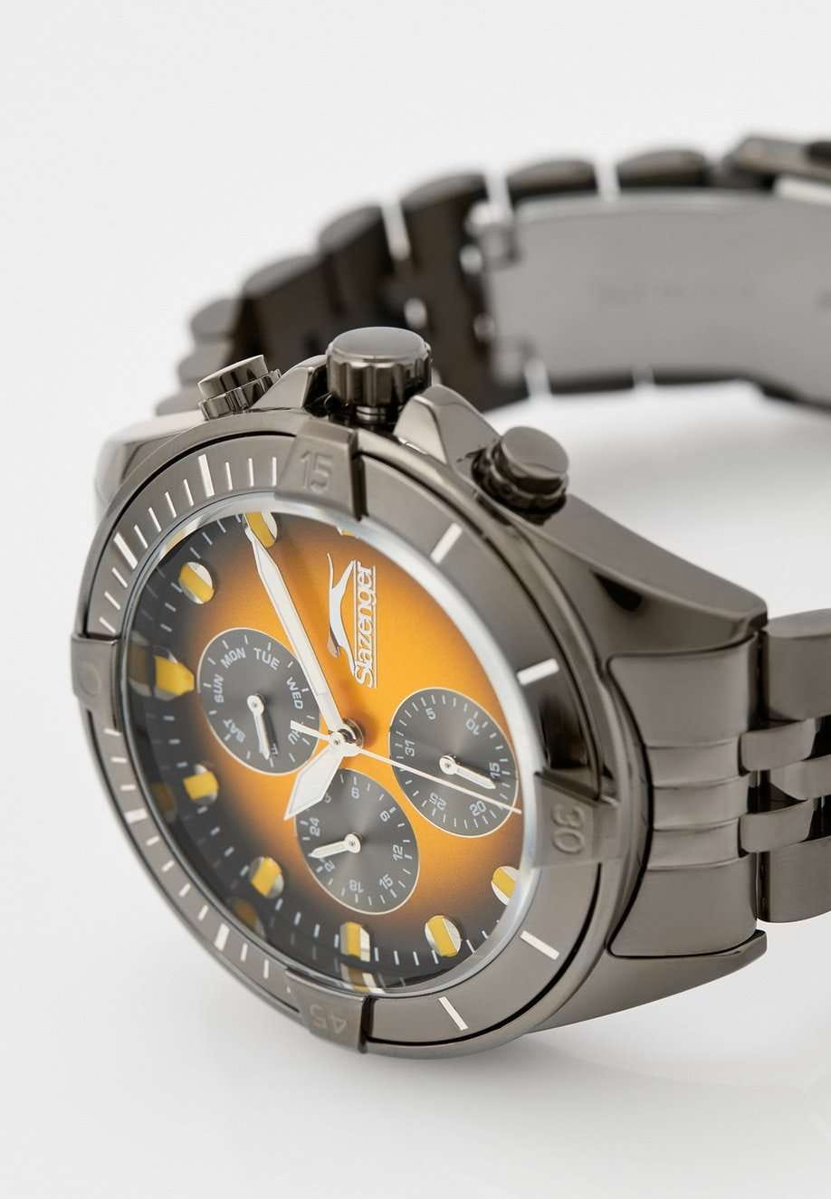 Часы Slazenger SL.09.2227.2.03 — это стильная и функциональная модель, созданная для современных мужчин, ценящих качество и надежность. Корпус из прочного металла с черным IP-покрытиемIP-покрытиеМетод ионного напыления. Демонстрирует повышенную устойчивость к истиранию, окислению и химическим веществам. Под воздействием высокого давления и температуры около 1500°C молекулы металла надёжно соединяются с частицами корпуса часов. и безельБезельВнешний ободок, закрепляющий стекло. В спортивных часах так называется поворотное кольцо с делениями на циферблате, выполняет роль таймера – замеряет отрезки времени на шкале. Неподвижный безель – элемент декора. Однонаправленно вращающийся безель на дайверских часах позволяет фиксировать моменты погружения и выныривания на поверхность. диаметром 46 мм и толщиной 12 мм придаёт часам солидный вид, а черный металлический браслет с IP-покрытиемIP-покрытиеМетод ионного напыления. Демонстрирует повышенную устойчивость к истиранию, окислению и химическим веществам. Под воздействием высокого давления и температуры около 1500°C молекулы металла надёжно соединяются с частицами корпуса часов. и с раскладной застёжкойРаскладная застёжкаТакой тип застёжки используется только на браслетах из металла. Она никогда не раскрывается полностью, происходит разделение на 2 и более частей. Раскладывающая застёжка снизит вероятность потери часов к минимуму. обеспечивает удобство при ношении. Надежный кварцевый механизм гарантирует точность хода, а минеральное стеклоМинеральное стеклоМинеральное стекло представляет собой искусственно выращенный минерал кварца. Такое стекло отличается особой устойчивостью к повреждениям и царапинам. Уступает по некоторым качествам сапфировому стеклу. защищает градиентный черно-желтый циферблат от царапин. Модель оснащена дополнительными малыми циферблатами, отображающими дату, день недели и текущее время в 24-часовом формате, что делает часы особенно практичными. Для удобства использования в темное время суток предусмотрено люминесцентное покрытиеЛюминесцентное покрытиеПозволяет считывать показания времени в темноте. Производители наносят на стрелки, часовые индексы, безель или поверхность циферблата светонакопительный состав, дающий холодное свечение. стрелок. Заводная головка имеет специальную защиту. Водозащита уровня WR 50 позволяет не беспокоиться о случайном попадании воды. Вес изделия составляет 161 грамм. Эти часы станут отличным выбором для тех, кто ценит элегантность и функциональность в одном аксессуаре.
