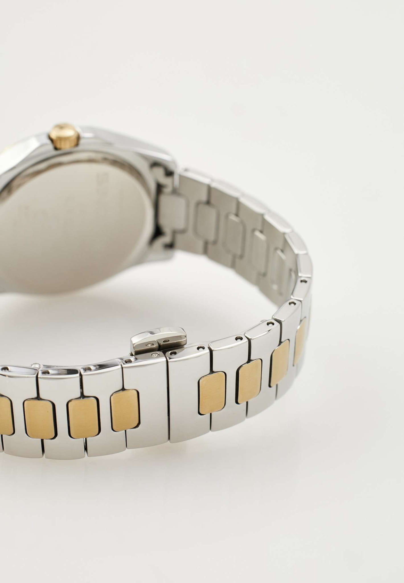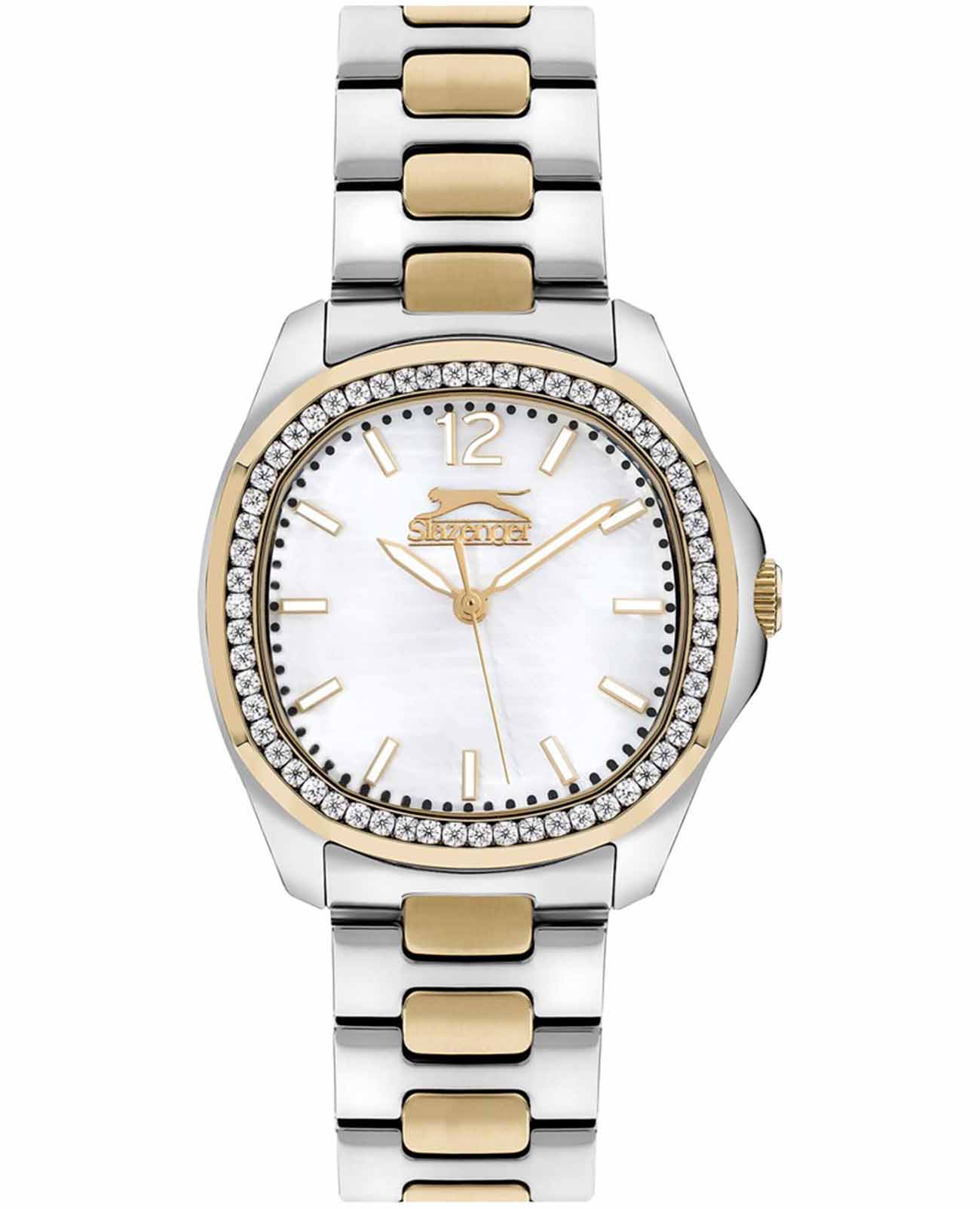 Часы Slazenger SL.09.2238.3.03 – это изысканный аксессуар, который станет стильным акцентом любого образа. Модель оснащена надежным кварцевым механизмом. Корпус из прочного металла размером 34х34 мм украшен россыпью сверкающих фианитов по безелюБезельВнешний ободок, закрепляющий стекло. В спортивных часах так называется поворотное кольцо с делениями на циферблате, выполняет роль таймера – замеряет отрезки времени на шкале. Неподвижный безель – элемент декора. Однонаправленно вращающийся безель на дайверских часах позволяет фиксировать моменты погружения и выныривания на поверхность., который к тому же с золотистым IP-покрытиемIP-покрытиеМетод ионного напыления. Демонстрирует повышенную устойчивость к истиранию, окислению и химическим веществам. Под воздействием высокого давления и температуры около 1500°C молекулы металла надёжно соединяются с частицами корпуса часов., что придает часам особое сияние и элегантность. Белый перламутровый циферблат с логотипом бренда защищен стойким к царапинам минеральным стекломМинеральное стеклоМинеральное стекло представляет собой искусственно выращенный минерал кварца. Такое стекло отличается особой устойчивостью к повреждениям и царапинам. Уступает по некоторым качествам сапфировому стеклу.. Четкие часовые метки в виде лаконичных штрихов и крупная арабская цифра 12 обеспечивают удобство чтения времени. Заводная головка с рифлением дополнена защитой для повышения долговечности. Металлический браслет с частичным золотистым IP-покрытиемIP-покрытиеМетод ионного напыления. Демонстрирует повышенную устойчивость к истиранию, окислению и химическим веществам. Под воздействием высокого давления и температуры около 1500°C молекулы металла надёжно соединяются с частицами корпуса часов. шириной 18 мм надежно фиксируется на запястье с помощью застежки «бабочка»Застёжка "бабочка"Такой вид застёжки дополняется предохранителями, помогающими избежать случайного раскрытия браслета. Обладают изящным исполнением. . Для удобства использования в темное время суток предусмотрено люминесцентное покрытиеЛюминесцентное покрытиеПозволяет считывать показания времени в темноте. Производители наносят на стрелки, часовые индексы, безель или поверхность циферблата светонакопительный состав, дающий холодное свечение. стрелок. Водозащита 30WR позволяет не беспокоиться о случайных брызгах. Вес изделия составляет 92 грамма, что делает часы комфортными для ежедневного ношения. Эти часы идеально подойдут для тех, кто ценит гармонию стиля, качества и функциональности.