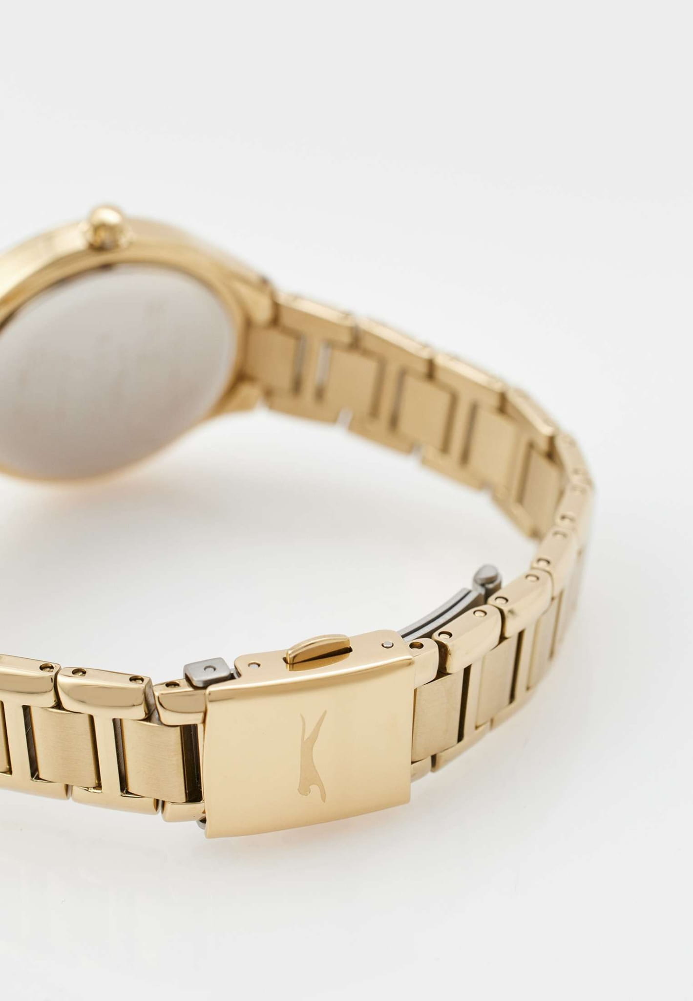 Часы Slazenger SL.09.2254.3.03 — это стильный и надежный аксессуар, который подчеркнет ваш индивидуальный образ. Корпус и браслет выполнены из инновационного суперметалла с изящным золотистым IP-покрытиемIP-покрытиеМетод ионного напыления. Демонстрирует повышенную устойчивость к истиранию, окислению и химическим веществам. Под воздействием высокого давления и температуры около 1500°C молекулы металла надёжно соединяются с частицами корпуса часов., обладающего особой прочностью и долговечностью благодаря специальной технологии покрытия. Модель оснащена точным кварцевым механизмом, который обеспечивает стабильную работу и не требует ежедневного завода. Под прочным минеральным стекломМинеральное стеклоМинеральное стекло представляет собой искусственно выращенный минерал кварца. Такое стекло отличается особой устойчивостью к повреждениям и царапинам. Уступает по некоторым качествам сапфировому стеклу. расположен лаконичный перламутровый циферблат, придающий часам элегантный и современный вид. Стальной браслет с раскладной застёжкойРаскладная застёжкаТакой тип застёжки используется только на браслетах из металла. Она никогда не раскрывается полностью, происходит разделение на 2 и более частей. Раскладывающая застёжка снизит вероятность потери часов к минимуму. обеспечивает комфортную посадку. Диаметр корпуса составляет 32 мм, толщина — 8 мм, что делает часы аккуратными и удобными для повседневного ношения. Класс водозащиты 3 атмосферы защищает механизм от случайных брызг и капель дождя.