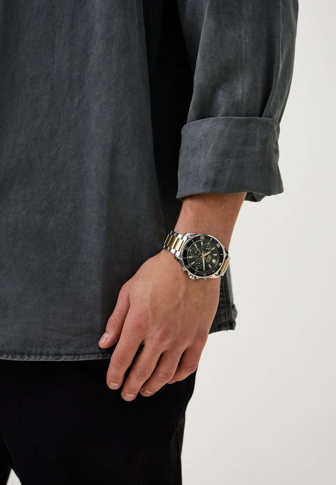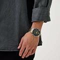 Часы Slazenger SL.09.2273.2.05 – стильный и функциональный аксессуар, который станет достойным дополнением к вашему образу. Модель оснащена надежным кварцевым механизмом, заключенным в корпус из инновационного суперметалла – прочного сплава на основе меди с пониженным содержанием цинка и никеля и специальным покрытием, устойчивым к износу. На безельБезельВнешний ободок, закрепляющий стекло. В спортивных часах так называется поворотное кольцо с делениями на циферблате, выполняет роль таймера – замеряет отрезки времени на шкале. Неподвижный безель – элемент декора. Однонаправленно вращающийся безель на дайверских часах позволяет фиксировать моменты погружения и выныривания на поверхность. нанесено черное IP-покрытиеIP-покрытиеМетод ионного напыления. Демонстрирует повышенную устойчивость к истиранию, окислению и химическим веществам. Под воздействием высокого давления и температуры около 1500°C молекулы металла надёжно соединяются с частицами корпуса часов., что придает аксессуару утончённый и универсальный внешний вид. Зеленый циферблат под минеральным стекломМинеральное стеклоМинеральное стекло представляет собой искусственно выращенный минерал кварца. Такое стекло отличается особой устойчивостью к повреждениям и царапинам. Уступает по некоторым качествам сапфировому стеклу. дополнен отдельными счетчиками: 24-часовой указатель времени, индикаторы даты и дня недели. Диаметр корпуса составляет 44 мм, а толщина – 12 мм, что обеспечивает комфортную посадку на запястье и подчёркивает современный стиль часов. Браслет из суперметалла с частичным золотистым  IP-покрытиемIP-покрытиеМетод ионного напыления. Демонстрирует повышенную устойчивость к истиранию, окислению и химическим веществам. Под воздействием высокого давления и температуры около 1500°C молекулы металла надёжно соединяются с частицами корпуса часов. и с раскладной застёжкойРаскладная застёжкаТакой тип застёжки используется только на браслетах из металла. Она никогда не раскрывается полностью, происходит разделение на 2 и более частей. Раскладывающая застёжка снизит вероятность потери часов к минимуму. обеспечивает комфортную посадку. Стрелки и метки с люминесцентным покрытиемЛюминесцентное покрытиеПозволяет считывать показания времени в темноте. Производители наносят на стрелки, часовые индексы, безель или поверхность циферблата светонакопительный состав, дающий холодное свечение. удобно подсвечиваются в темноте после зарядки на свету. Водонепроницаемость 5 АТМ защищает механизм от брызг и дождя, позволяя не беспокоиться о сохранности аксессуара в повседневной жизни. Эта модель станет отличным выбором для ежедневного ношения или особых случаев и прекрасным подарком для мужчины к любому празднику.