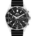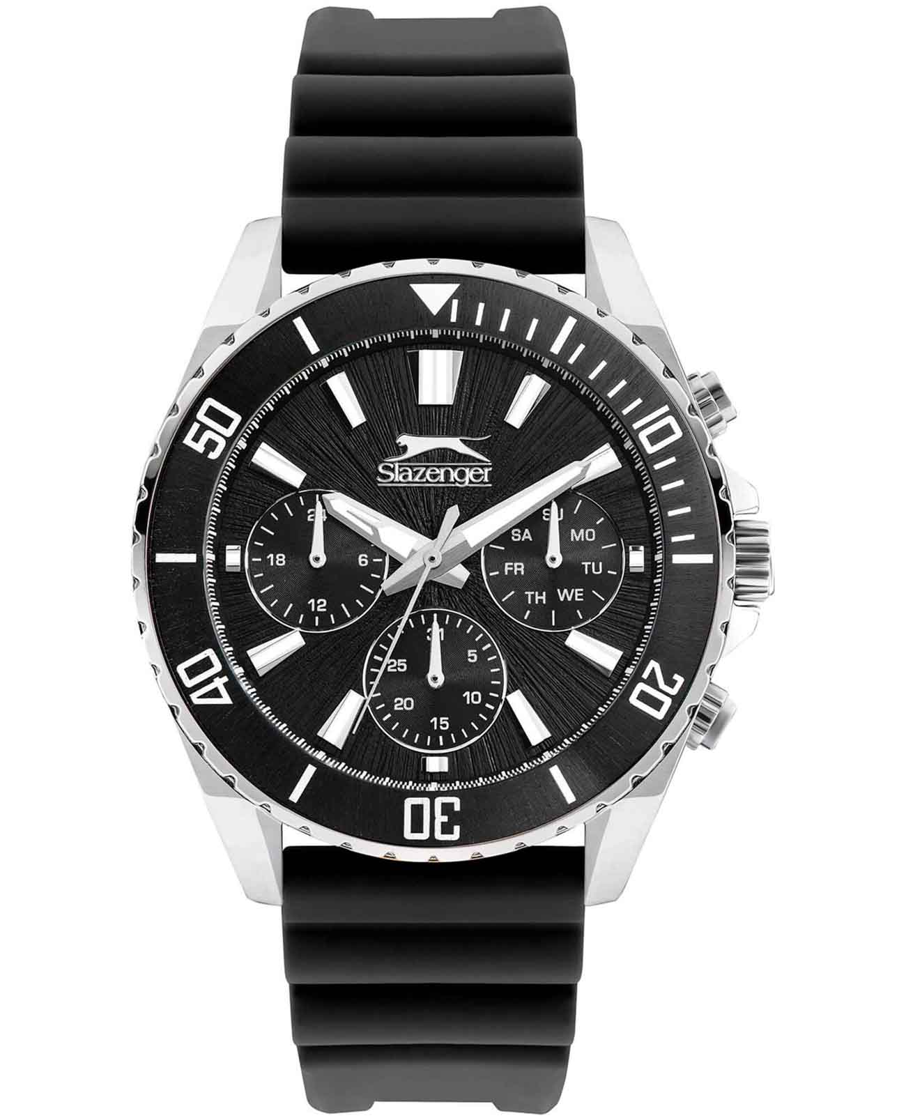 Часы Slazenger SL.09.2274.2.01 сочетают в себе современный стиль и надежность. Круглый корпус диаметром 44 мм выполнен из суперметалла, что придает модели выразительный и элегантный вид. Черный циферблат с логотипом бренда защищен прочным минеральным стекломМинеральное стеклоМинеральное стекло представляет собой искусственно выращенный минерал кварца. Такое стекло отличается особой устойчивостью к повреждениям и царапинам. Уступает по некоторым качествам сапфировому стеклу., рифленый сатинированный безельБезельВнешний ободок, закрепляющий стекло. В спортивных часах так называется поворотное кольцо с делениями на циферблате, выполняет роль таймера – замеряет отрезки времени на шкале. Неподвижный безель – элемент декора. Однонаправленно вращающийся безель на дайверских часах позволяет фиксировать моменты погружения и выныривания на поверхность. с черным IP-покрытиемIP-покрытиеМетод ионного напыления. Демонстрирует повышенную устойчивость к истиранию, окислению и химическим веществам. Под воздействием высокого давления и температуры около 1500°C молекулы металла надёжно соединяются с частицами корпуса часов. украшен минутными отметками. На дополнительных циферблатах отображаются дата, день недели и время в 12- и 24-часовом формате. Надежный кварцевый механизм обеспечивает точность хода. Силиконовый черный ремешок шириной 22 мм удобно фиксируется на запястье с помощью классической застежки. Стрелки и метки с люминесцентным покрытиемЛюминесцентное покрытиеПозволяет считывать показания времени в темноте. Производители наносят на стрелки, часовые индексы, безель или поверхность циферблата светонакопительный состав, дающий холодное свечение. удобно подсвечиваются в темноте после зарядки на свету. Водозащита 50WR позволяет использовать часы в повседневной жизни, а вес 90 г и толщина корпуса 12 мм делают их комфортными для ежедневного ношения.