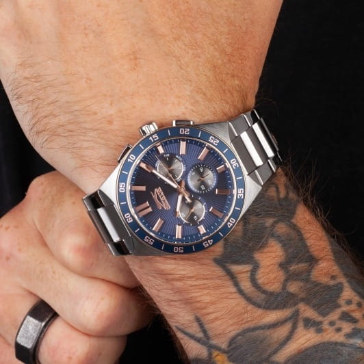 Часы Slazenger SL.09.2285.2.03 — это стильное решение для тех, кто ценит сочетание выразительного дизайна и функциональности. Модель оснащена надежным кварцевым механизмом, который заключен в прочный корпус диаметром 45 мм и толщиной 13 мм, выполненный из суперметалла — современного сплава на основе меди с пониженным содержанием цинка и никеля, обладающего высокой прочностью и устойчивостью к износу, а на золотистый безельБезельВнешний ободок, закрепляющий стекло. В спортивных часах так называется поворотное кольцо с делениями на циферблате, выполняет роль таймера – замеряет отрезки времени на шкале. Неподвижный безель – элемент декора. Однонаправленно вращающийся безель на дайверских часах позволяет фиксировать моменты погружения и выныривания на поверхность. нанесено синее IP-покрытиеIP-покрытиеМетод ионного напыления. Демонстрирует повышенную устойчивость к истиранию, окислению и химическим веществам. Под воздействием высокого давления и температуры около 1500°C молекулы металла надёжно соединяются с частицами корпуса часов. и секундная шкала. Минеральное стеклоМинеральное стеклоМинеральное стекло представляет собой искусственно выращенный минерал кварца. Такое стекло отличается особой устойчивостью к повреждениям и царапинам. Уступает по некоторым качествам сапфировому стеклу. защищает синий циферблат от царапин и повреждений. Часы оснащены дополнительными циферблатами для отображения 24-часового времени, даты и дня недели, что делает использование еще более удобным. Браслет также выполнен из суперметалла с раскладной застёжкойРаскладная застёжкаТакой тип застёжки используется только на браслетах из металла. Она никогда не раскрывается полностью, происходит разделение на 2 и более частей. Раскладывающая застёжка снизит вероятность потери часов к минимуму. и гармонично дополняет общий облик аксессуара. Циферблат оснащён люминесцентным покрытиемЛюминесцентное покрытиеПозволяет считывать показания времени в темноте. Производители наносят на стрелки, часовые индексы, безель или поверхность циферблата светонакопительный состав, дающий холодное свечение. стрелок и меток, что позволяет легко определять время даже в условиях плохой освещенности. Класс водозащиты 5 АТМ позволяет не бояться случайных брызг и дождя, а гарантия 12 месяцев подтверждает высокое качество изделия.