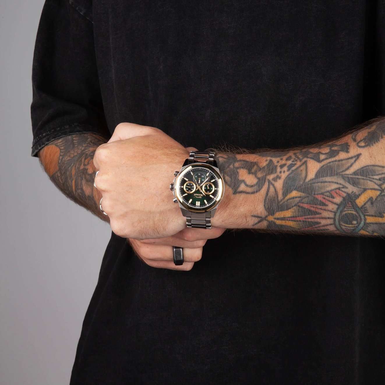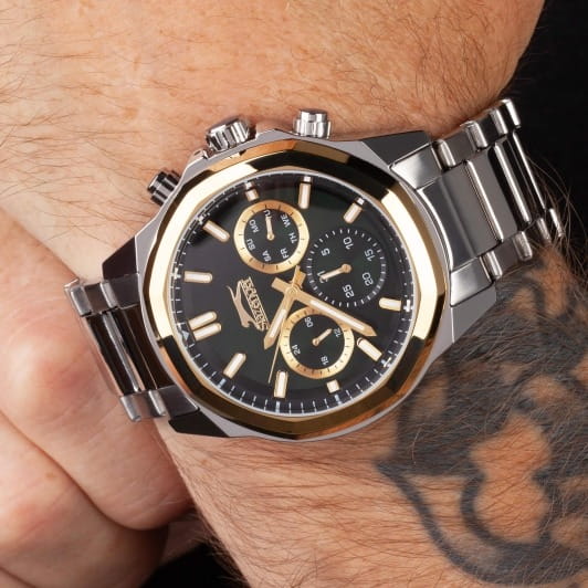 Часы Slazenger SL.09.2289.2.02 — это сочетание современного дизайна и функциональности, идеально подходящее для тех, кто ценит стиль и надежность. Корпус и браслет выполнены из прочного суперметалла, что придаёт модели солидный и эффектный вид. Зеленый циферблат с лаконичными отметками и фирменным логотипом защищён устойчивым к царапинам минеральным стекломМинеральное стеклоМинеральное стекло представляет собой искусственно выращенный минерал кварца. Такое стекло отличается особой устойчивостью к повреждениям и царапинам. Уступает по некоторым качествам сапфировому стеклу.. Дополнительные функции включают отображение даты и дня недели, а также 12- и 24-часовой формат времени на отдельных мини-циферблатах, что делает использование часов максимально удобным. Заводная головка оснащена защитой, а надёжная раскладная застёжкаРаскладная застёжкаТакой тип застёжки используется только на браслетах из металла. Она никогда не раскрывается полностью, происходит разделение на 2 и более частей. Раскладывающая застёжка снизит вероятность потери часов к минимуму. обеспечивает комфортную посадку на запястье. Особое внимание привлекает восьмигранный безельБезельВнешний ободок, закрепляющий стекло. В спортивных часах так называется поворотное кольцо с делениями на циферблате, выполняет роль таймера – замеряет отрезки времени на шкале. Неподвижный безель – элемент декора. Однонаправленно вращающийся безель на дайверских часах позволяет фиксировать моменты погружения и выныривания на поверхность. с золотистым IP-покрытиемIP-покрытиеМетод ионного напыления. Демонстрирует повышенную устойчивость к истиранию, окислению и химическим веществам. Под воздействием высокого давления и температуры около 1500°C молекулы металла надёжно соединяются с частицами корпуса часов.. Циферблат оснащён люминесцентным покрытиемЛюминесцентное покрытиеПозволяет считывать показания времени в темноте. Производители наносят на стрелки, часовые индексы, безель или поверхность циферблата светонакопительный состав, дающий холодное свечение. стрелок и меток, что позволяет легко определять время даже в условиях плохой освещенности. Водозащита 50WR позволяет не беспокоиться о случайных брызгах и дождевых каплях. Диаметр корпуса составляет 46 мм, толщина — 14 мм, вес — 165 г, благодаря чему часы выглядят внушительно и подчёркивают индивидуальный стиль владельца. Эта модель станет отличным акцентом в вашем образе и подчеркнёт вашу уверенность в любой ситуации.